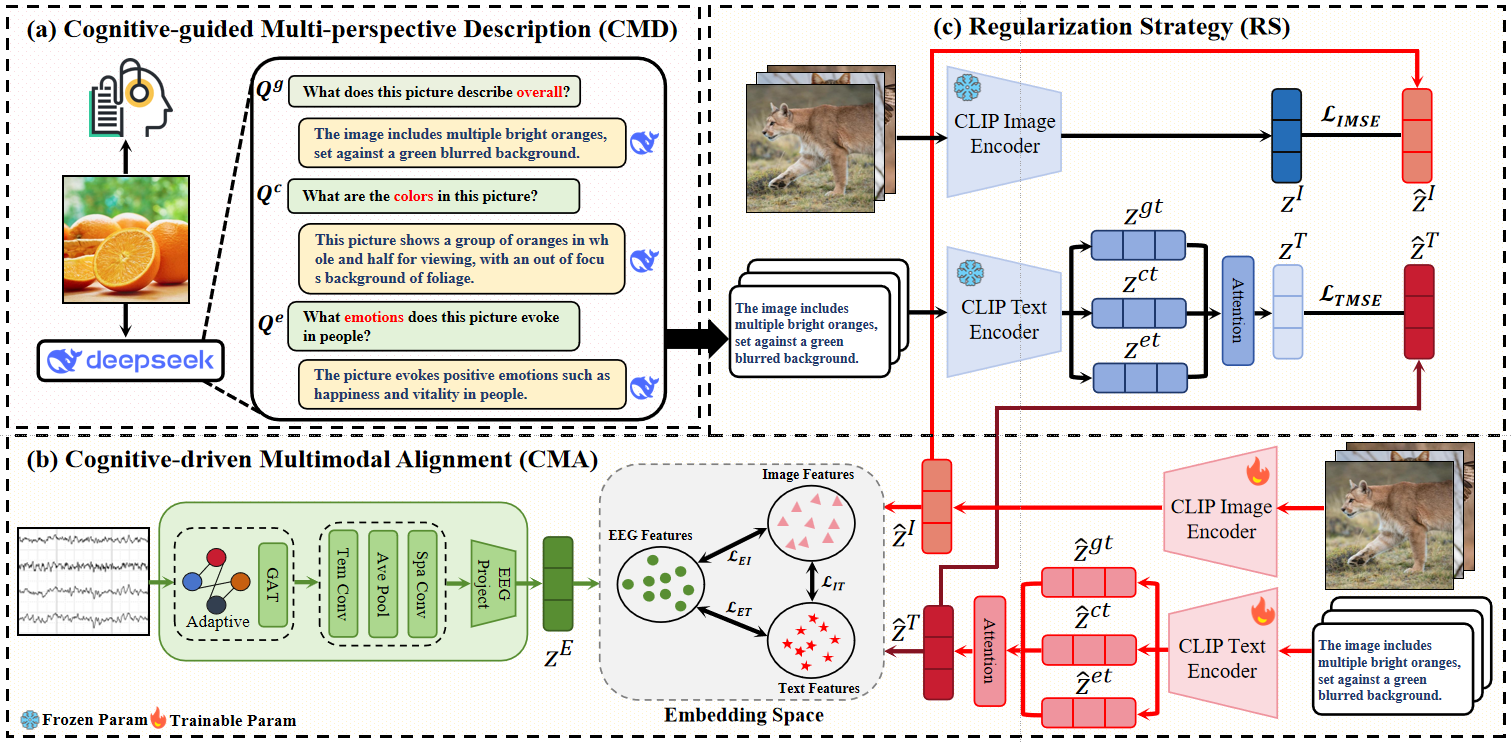 脑电(EEG)图像检索是脑机接口领域中实现神经信号与视觉刺激语义关联的重要任务。由于EEG信号具有较强的抽象性与个体差异,而图像模态信号包含丰富的细粒度视觉语义,二者之间存在显著的模态鸿沟,容易造成跨模态语义对齐不充分,进而制约检索性能的提升。针对上述难题,本文提出了一种面向EEG-图像细粒度对齐的认知启发多视角描述框架(CIMD)。具体而言,首先设计认知引导的多视角描述模块(CMD),结合EEG相关认知特征,从全局、颜色和情感三个视角借助多模态大模型生成认知启发的文本描述,作为连接EEG与图像的语义桥梁,从而缓解两种模态之间的信息差异;其次,提出认知驱动的多模态对齐模块(CMA),利用上述多视角文本描述引导预训练模型微调,构建统一的EEG、图像与文本共享嵌入空间,以实现更精细的跨模态语义对齐;此外,为在提升模型适应性的同时保持其泛化能力,进一步引入正则化策略,对微调过程中的特征漂移进行约束,实现有效的跨模态脑电图像对齐。上述工作得到了国家自然科学基金、教育部人文社科项目的支持。