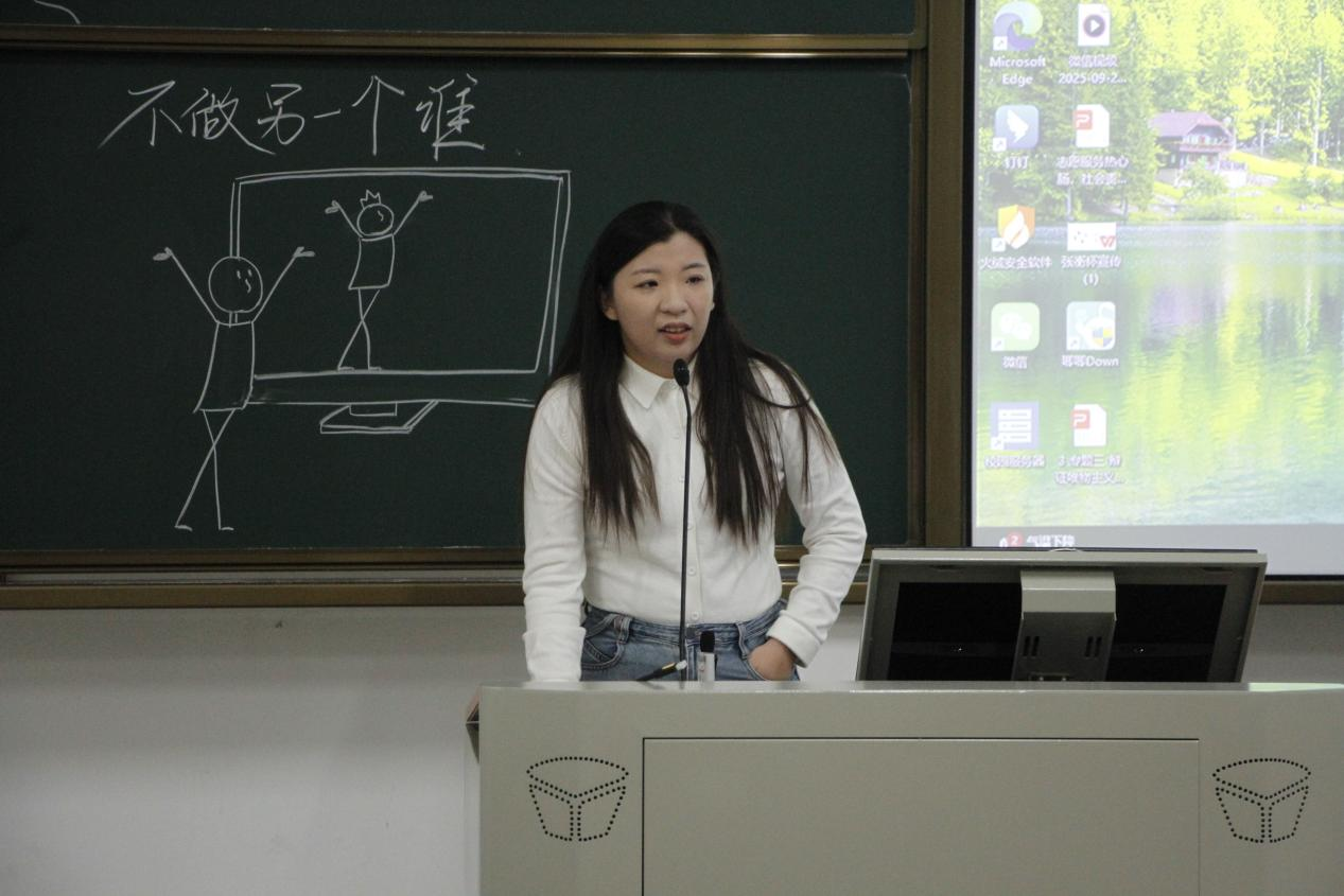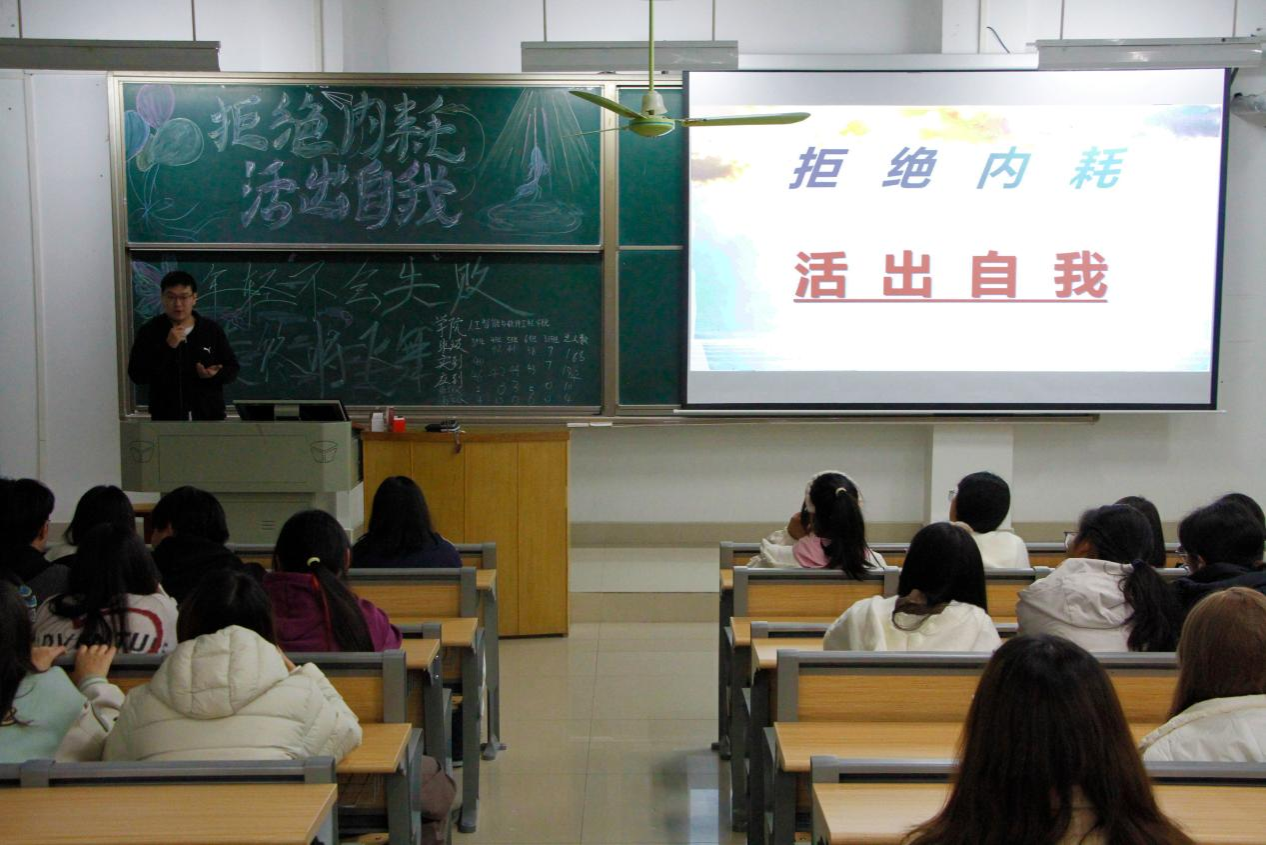 田羽博和李巧以“认清内耗本质”为切入点,通过大学生常见的 典型案例,并结合励志短片片段,直观呈现内耗对心理状态的负面影响,帮助学生快速对照自身、识别内耗信号。陈美羲和李青原聚焦情绪管理与自我接纳,分享“情绪日记记录法”“自我肯定暗示话术”等实用技巧,引导学生打破完美主义枷锁,学会客观看待自身优缺点。王玺涵和孙炎围绕内耗与压力展开分享,提出“拆解小目标降低行动门槛”和“每日制定优先级清单”两大具体方法,帮助学生缓解因目标模糊、压力过载产生的焦虑,进而提升行动力,破解内耗循环。崔纪宏和郭丹宁围绕“如何设定合理自我期望”等高频话题组织小组讨论,鼓励大家分享真实经历与困惑,通过思路交流,深化其对拒绝内耗的理解并强化实践认知。
