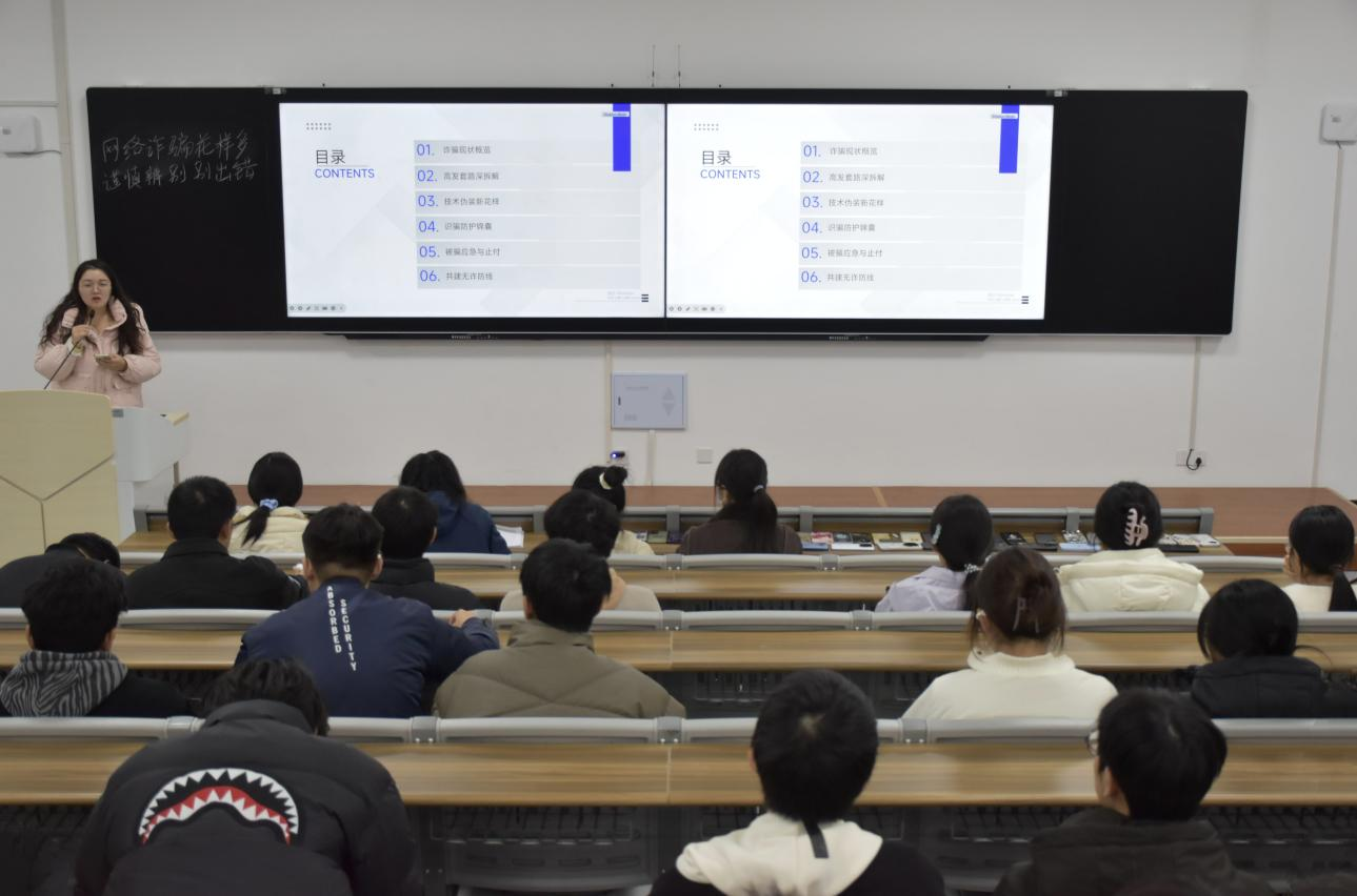 李巧和陈美羲聚焦大学生群体高发的网络诈骗类型,通过案例拆解,详细讲解刷单返利、虚假购物退款等诈骗套路,深度揭露了“小额返利诱骗大额投入”的骗局本质。王玺涵和田羽博通过PPT剖析了诈骗分子利用学生贪小便宜、防范意识薄弱等特点实施诈骗的套路,组织现场交流互动,鼓励学生分享反诈见闻与经历,进一步深化了学生的反诈风险认知。郭丹宁和王浩然通过讲解真实诈骗案例,让学生直观认识到个人信息泄露、轻信转账的危害,帮助学生清晰划定网络行为的安全边界。孙炎和崔纪宏围绕游戏账号交易、校园贷等隐蔽性较强的诈骗类型,系统讲解防范要点,传授“未知链接不点击、转账汇款多核实”的反诈技巧,呼吁学生争做校园反诈宣传员,主动向身边人普及反诈知识,共同筑牢校园安全防线。
