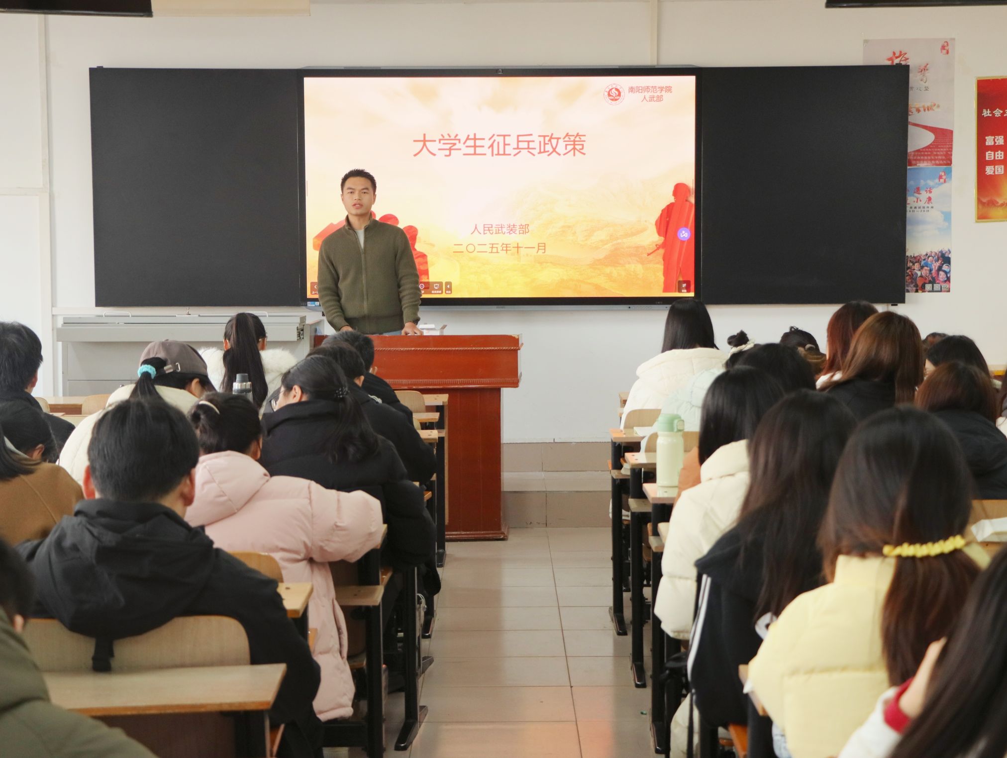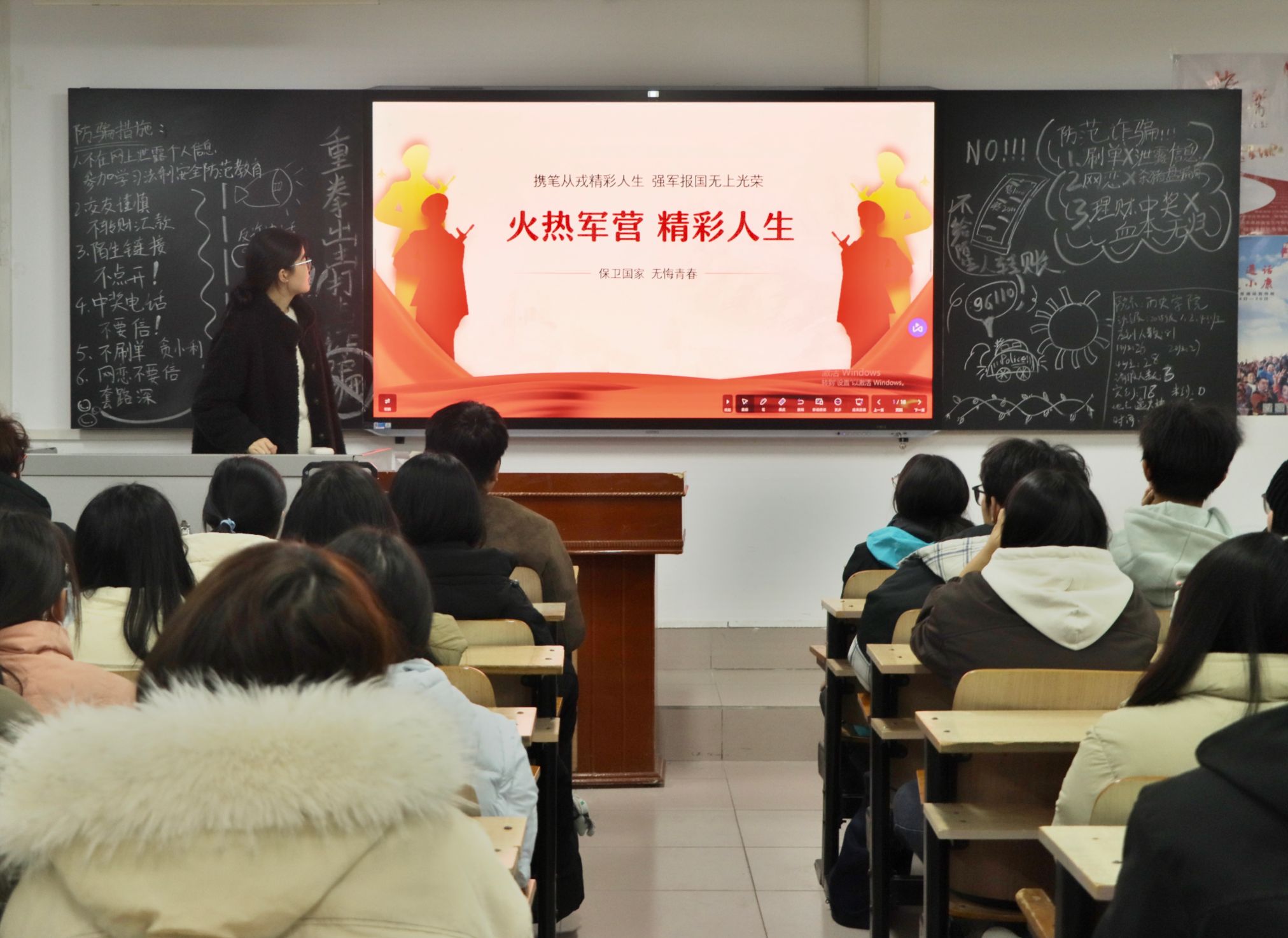 12月7日晚,辅导员周嘉璐在逸夫教学楼N405、N406教室,开展“火热军营,精彩人生”主题宣讲会,历史学院2025级全体学生参与,为同学们点亮参军报国的前行之路。周老师紧扣最新征兵政策,从入伍条件、体检标准、征兵时段等维度展开系统解读,详细介绍参军相关保障政策,帮助同学们全面厘清政策细节。同时,她通过视频、图片等素材,生动展示军人日常训练场景,让同学们直观感受军旅生活的热血与激情,进一步激发同学们对军旅生活的向往之情。