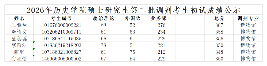 2026年历史学院硕士研究生第二批调剂考生初试成绩公示