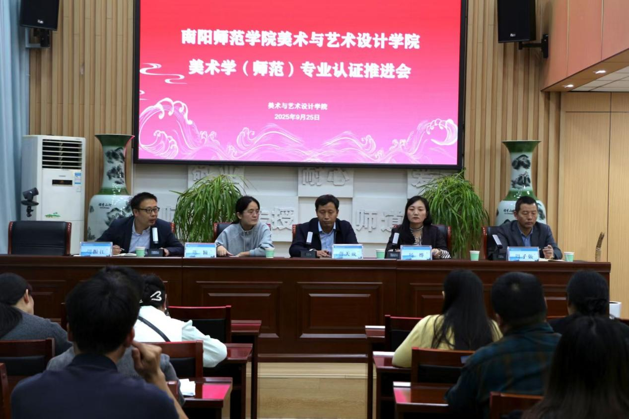 本网讯(通讯员 杜雨露/文 路柏松/图)为确保认证工作有序推进,准确聚焦核心任务,9月25日,美术与艺术设计学院于艺术楼三楼会议室开展南阳师范学院美术与艺术设计学院美术学(师范)专业认证推进会。院长曹天成,副院长周子强、胡振江,商丘师范学院美术系主任杨烨,教学办公室主任陈颖出席会议,全体美术学专业老师参会。