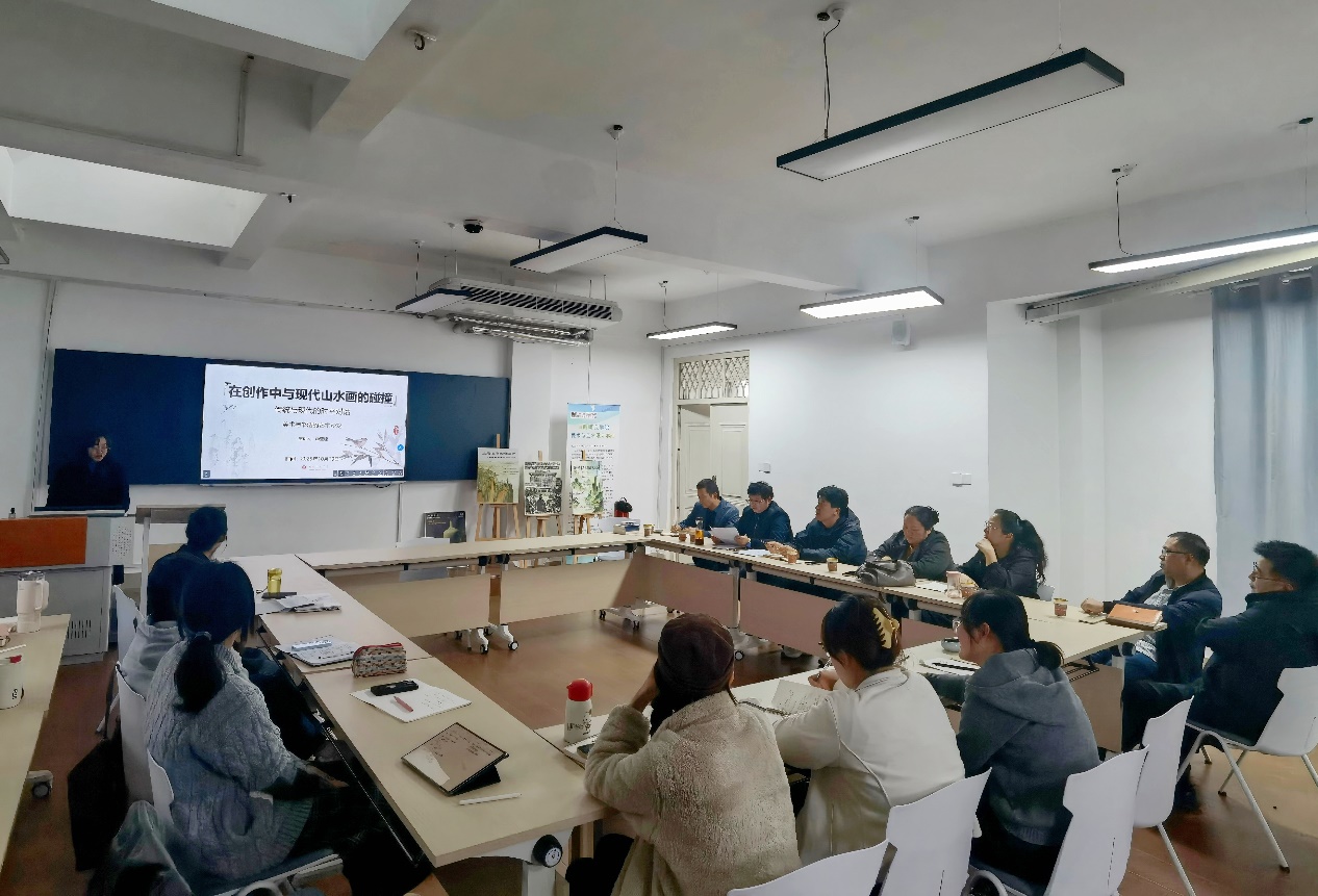 随后,第二位研究生以“在创作中与现代山水画的碰撞——传统与现代的时空对话”为题展开分享。该同学以自身创作实践为切入点,剖析传统山水画“皴、擦、点、染”技法与现代艺术中抽象表达、色彩构成的融合逻辑,呈现了传统美学精神与当代视觉语境的对话过程。王瑞强老师结合汇报内容提出专业建议,他指出,现代山水画创作需打破传统技法的思维定式,可尝试以“色块构建”替代传统皴法,强化画面的当代视觉张力;同时强调创作的核心在于“自我共鸣”,需通过笔墨传递对自然、生活的独特感悟,让技法服务于情感表达,最终实现作品与观者的情感联结,为同学们的创作实践指明深化方向。