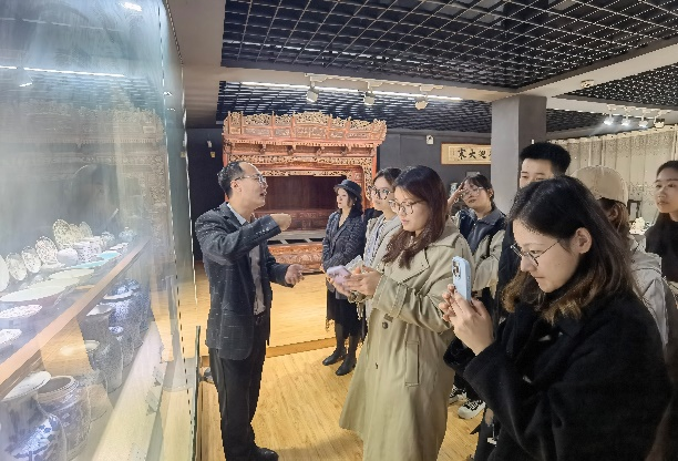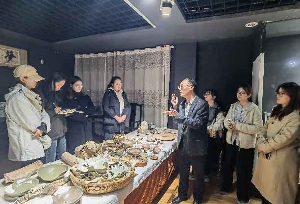 考察首日,师生们走进内乡县菊潭古瓷博物馆。博物馆馆长李海涛亲自接待并全程讲解,他围绕内乡窑的发展脉络,详细介绍了各时期器物的特征,从早期古朴厚重的青瓷,到中期纹饰繁复的白瓷,再到后期色彩艳丽的彩瓷,每一件都承载着特定时代的工艺水平与审美风尚。李馆长还展示了瓷器修复技术“锔瓷”,并介绍了邓瓷以高岭土为原料,经复杂工序烧制而成的过程,以及独特的剪纸贴画瓷器艺术。