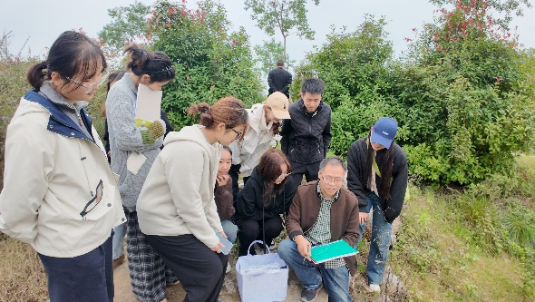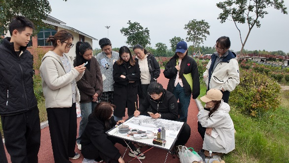 考察的最后一站是湿地公园,王瑞强副教授和蒋明林副教授分别进行了中国画和版画示范教学。王瑞强副教授以公园内的树木、石桥与塔为题材,分享了中国画“师法自然”的创作理念;蒋明林副教授以湿地公园的自然风光为原型,演示了版画的创作流程,让同学们在自然美景中感受艺术创作的魅力。