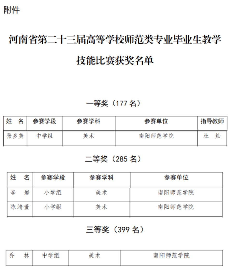 近日,河南省第二十三届高等学校师范类专业毕业生教学技能比赛圆满落下帷幕,南阳师范学院美术与艺术设计学院推选的4名参赛学子全员斩获殊荣:张多美获一等奖,李岩、陈靖萱获二等奖,乔林获三等奖,创下学院参赛以来历史最佳成绩。