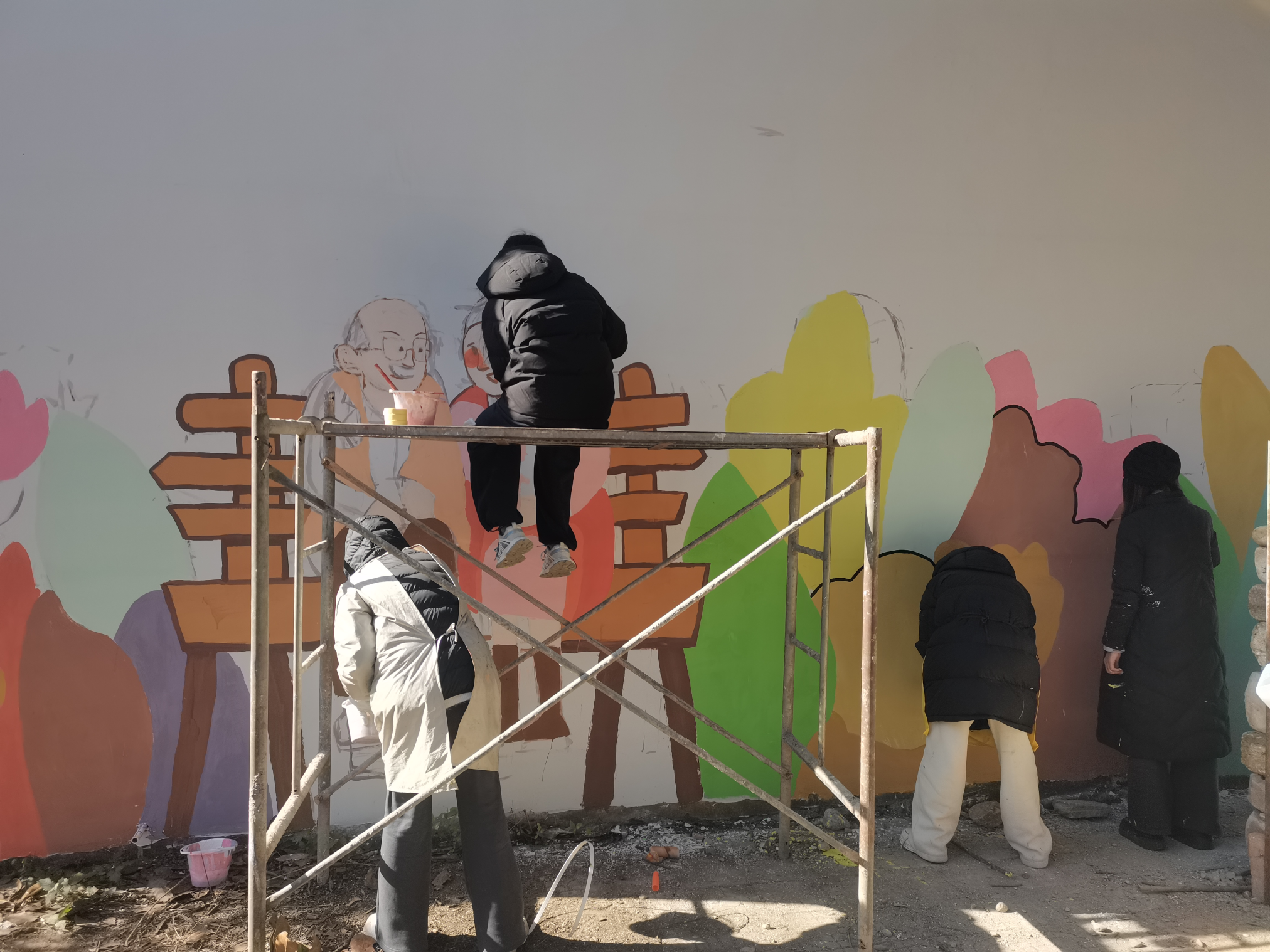 师生团队首先深入养老院实地勘察,仔细探讨建筑布局与周边环境特点,紧扣“尊老敬老”核心主题,快速敲定墙绘内容方向。创作过程中,学生们分工明确、各司其职,从线条起稿、精准勾线,到色彩填充、细节修饰,每一步都力求精益求精,尽显专业态度。徐智泉、刚政两位老师全程指导,针对色彩搭配的协调性、构图比例的合理性、主题呈现的感染力等关键细节,逐一提出专业优化建议,既保障了作品的艺术审美水准,又牢牢贴合养老院温暖、舒心的氛围定位。