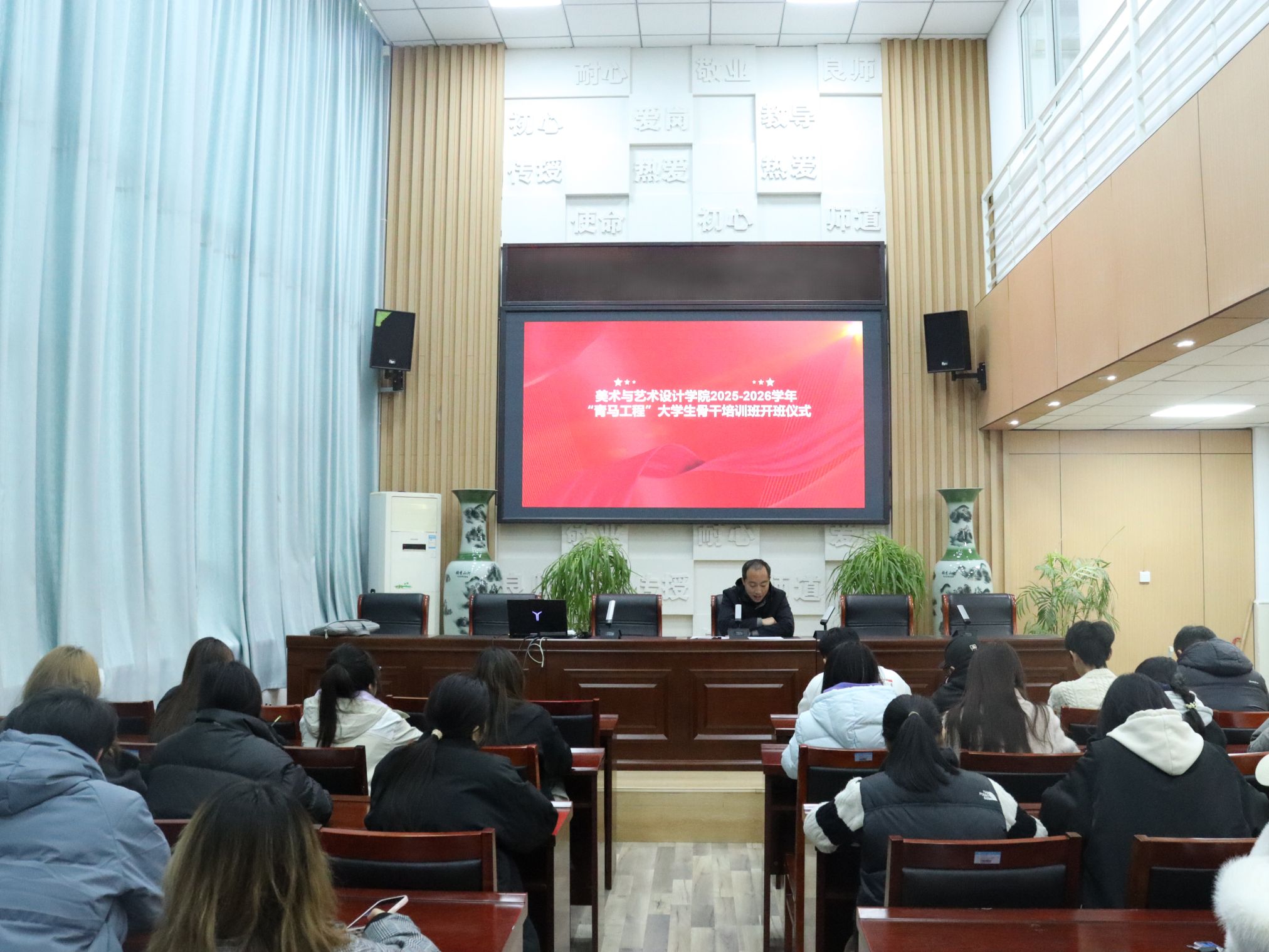 为深入贯彻学习习近平新时代中国特色社会主义思想和党的二十大精神,进一步落实立德树人根本任务,11月26日,美术与艺术设计学院于艺术楼三楼大会议室举行2025—2026学年“青马工程”大学生骨干培训班开班仪式。我院团委书记徐智泉在开班仪式上做动员讲话,上学年培训班学员代表在开班仪式上发言并交流学习心得,2025-2026学年培训班全体学员参加。