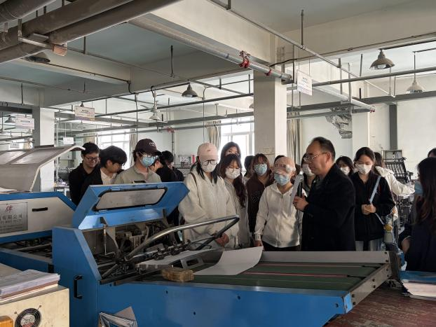本网讯(通讯员 陈靖云/文 张玉丹 张博伦/图) 为深化产教融合,推动专业理论知识与行业实践深度衔接,由视觉传达设计系王宁老师组织《书籍设计》课程2024级学生,于2026年4月9日前往南阳市双丰印务有限公司,开展实践教学活动。工作人员带领同学们参观了印刷车间、装订车间、成品加工区等核心区域,逐一讲解书籍印刷、折页、装订、裁切、包装等全流程工艺,细致解答同学们提出的各类问题。王宁老师和企业导师徐宏志老师分别结合企业生产实践,对同学们的书籍设计作业进行现场评讲。此次《书籍设计》课程实践教学,加深了同学们对视觉传达设计专业行业现状的认知,树立了理论联系实际的专业学习理念。
