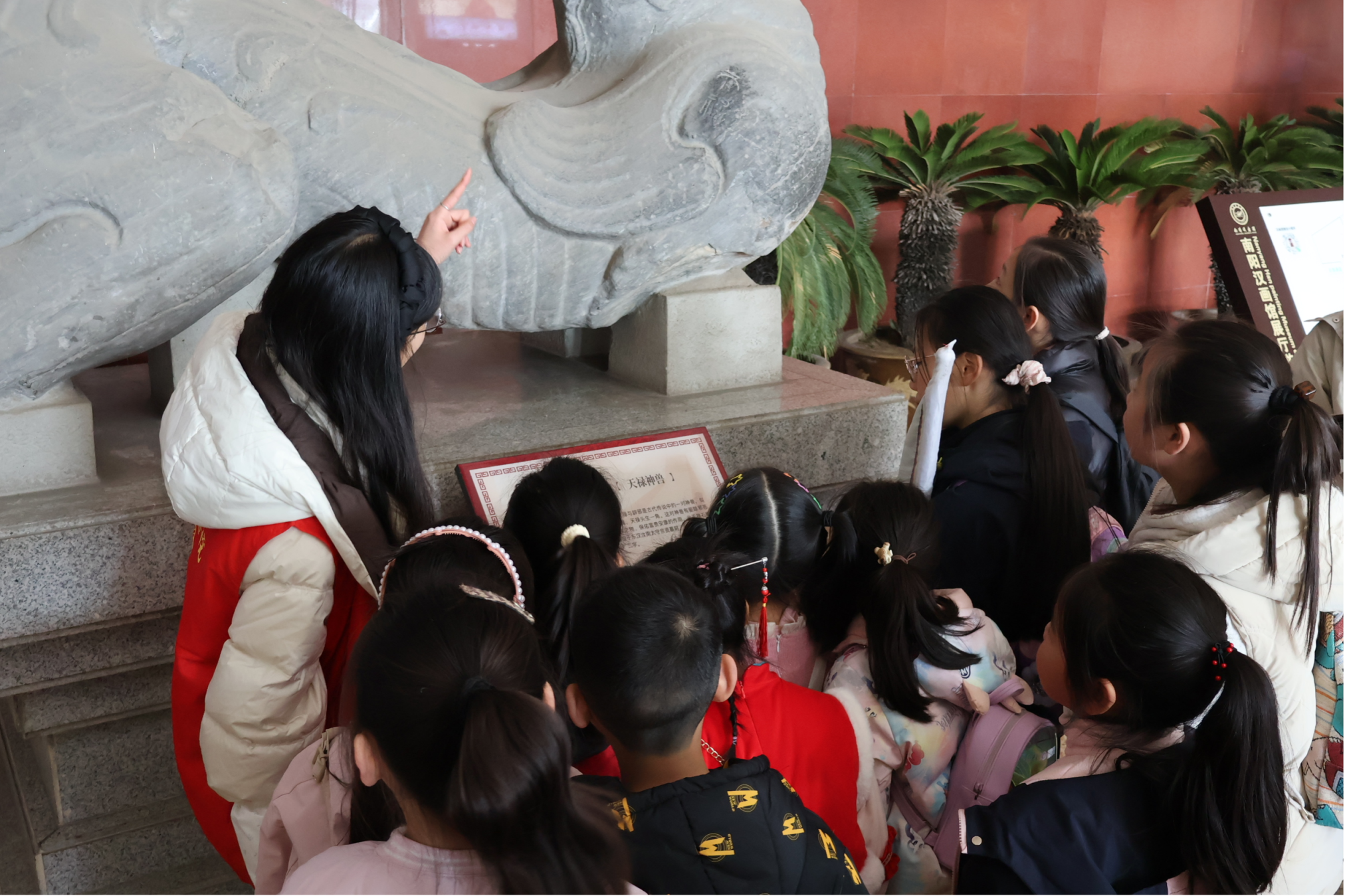 活动当天,汉画馆工作人员围绕场馆运行规范、安检操作流程、游客常见问题解答等内容,为志愿者们开展岗前培训,帮助大家快速熟悉岗位职责、精准掌握服务要点。培训结束后,志愿者们按照分工迅速投入服务工作,在各自岗位上履职尽责、热忱服务。在馆区入口处,志愿者耐心引导游客有序入馆,主动帮扶老人、儿童顺利完成安检,以贴心周到的服务保障参观秩序与出行安全;在馆内咨询台,志愿者们细致解答展厅分布、参观路线、便民设施等相关咨询,用专业服务为游客排忧解难;在参观区域,志愿者们化身文化讲解员,为少先队员开展汉代文化专题讲解,结合汉画石刻中的历史故事与艺术特色,用生动鲜活的语言带领孩子们穿越历史、走进传统文化,领略汉代文明的深厚底蕴与独特魅力。