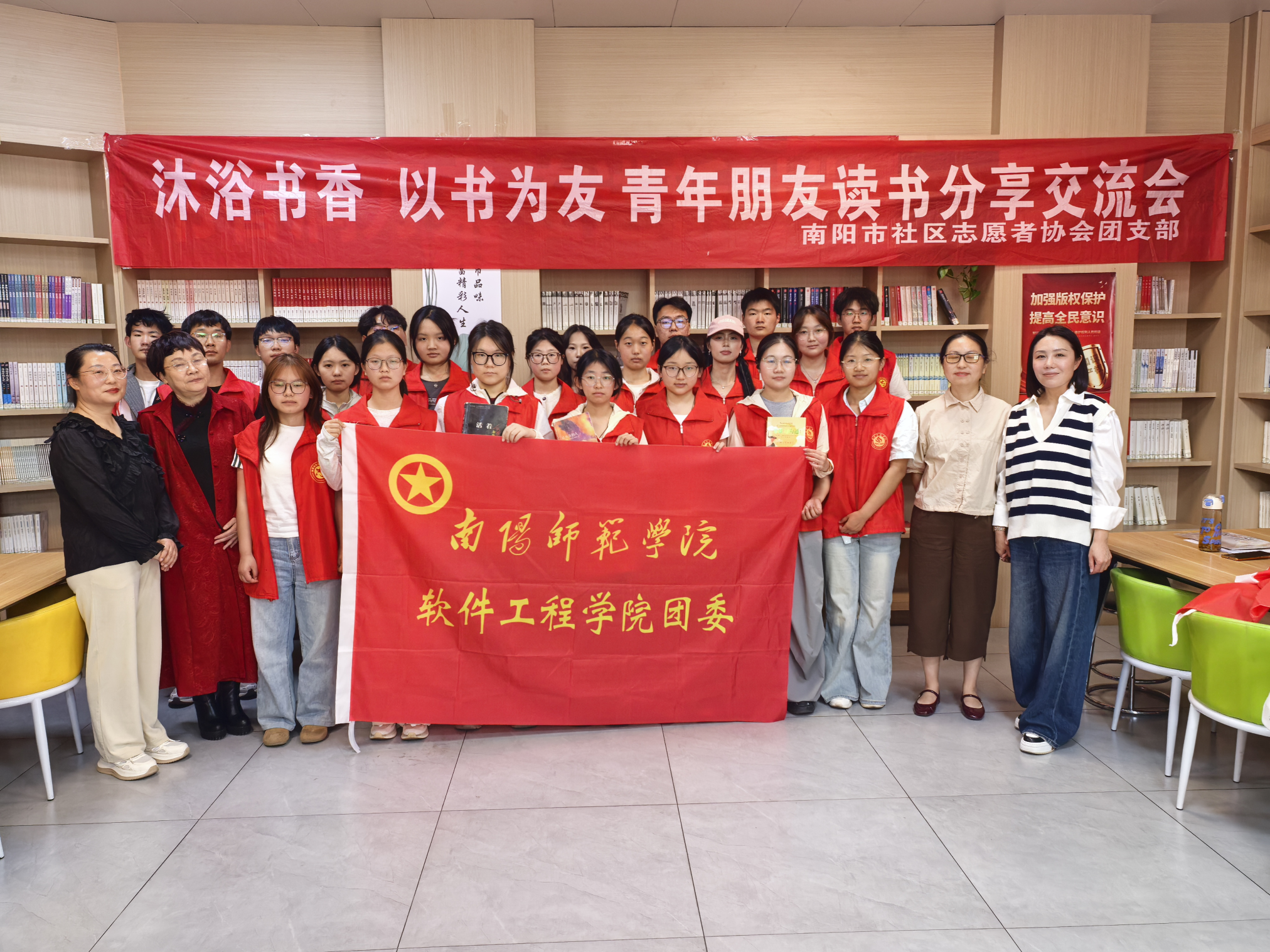 本网讯(通讯员 郭康达 王玺涵/文张丽芸 杨修贤/图)4月18日,软件工程学院组织青年志愿者前往南阳市中兴社区诸葛书屋,开展“沐浴书香 以书为友”读书分享交流活动。本次活动由学院志愿服务部策划主持,学院青年志愿者参加。