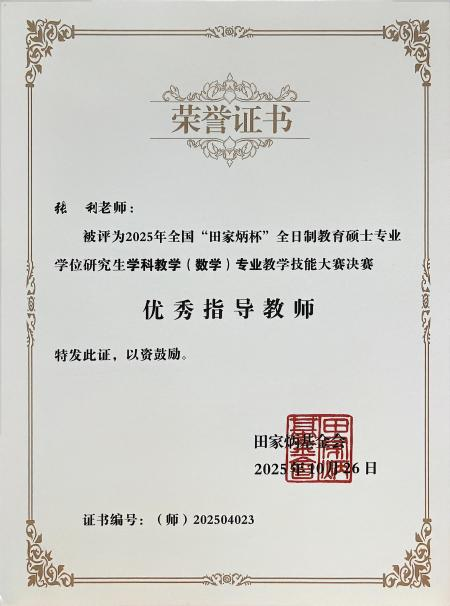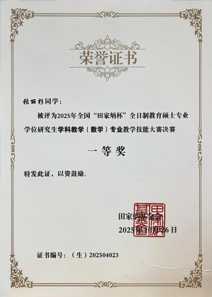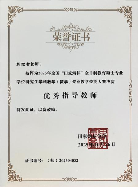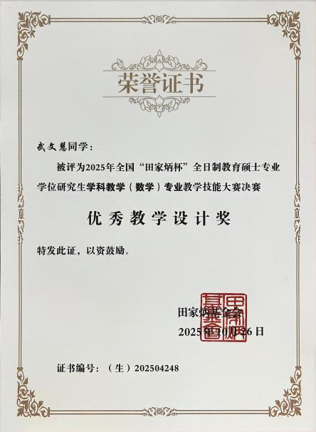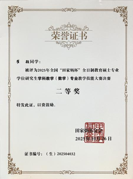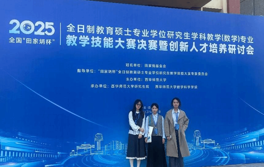 本网讯(通讯员 常艳明 图/文) 10月24-26日,2025年全国“田家炳杯”全日制教育硕士专业学位研究生学科教学(数学)专业教学技能大赛决赛在西华师范大学举行,我院选派的三位参赛研究生凭借扎实的专业基础和出色的教学表现荣获佳绩,获得一等奖1项、二等奖1项、优秀教学设计奖1项和优秀指导教师奖2项,充分展现了我院学子卓越的教学素养与综合能力。