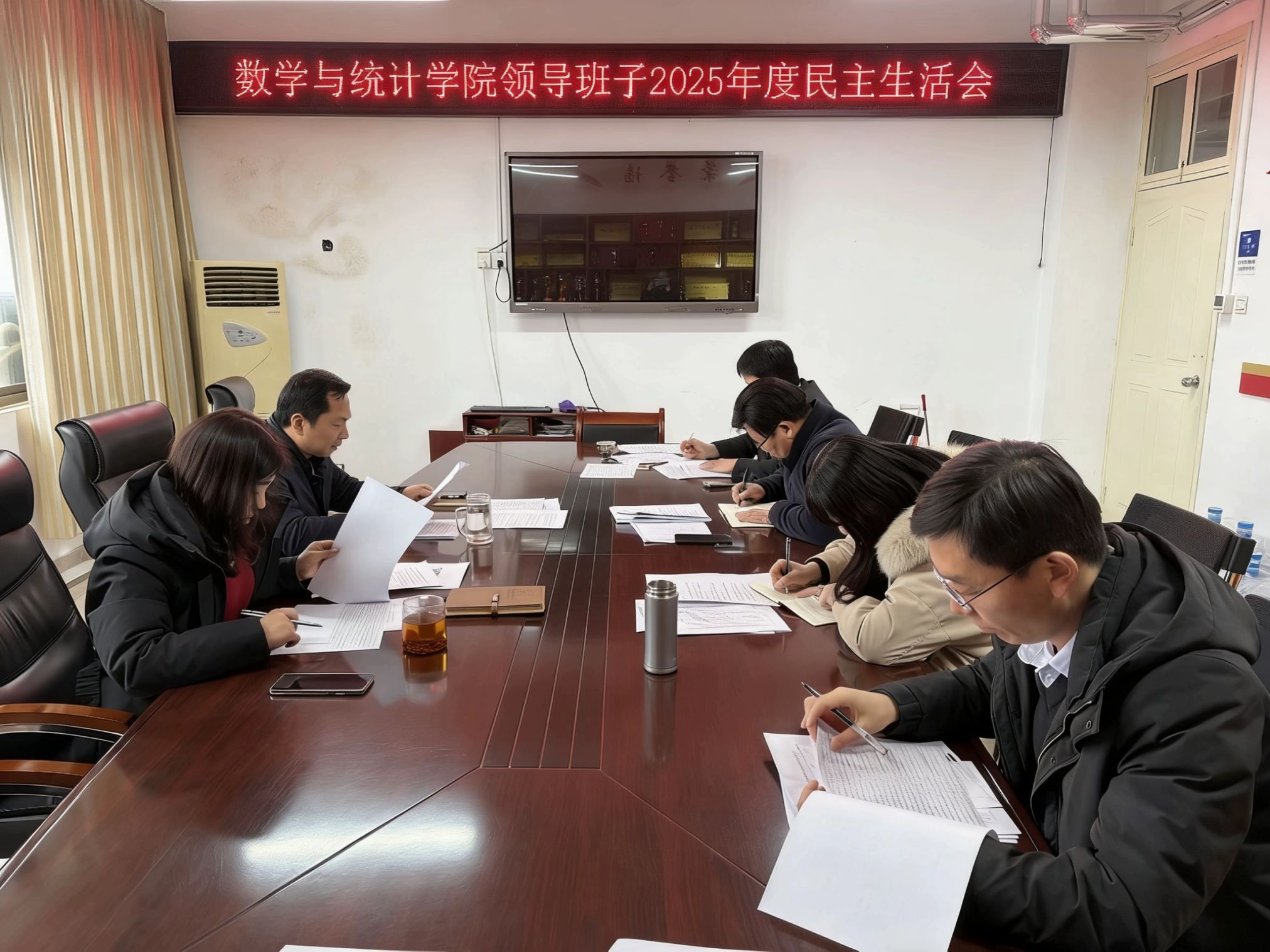 本网讯(通讯员 姜莹月 刘音/文 郭媞/图)3月6日下午,数学与统计学院在逸夫楼C507召开2025年度处级领导班子民主生活会。会议由学院党委书记冷元峰主持,全体领导班子参会。