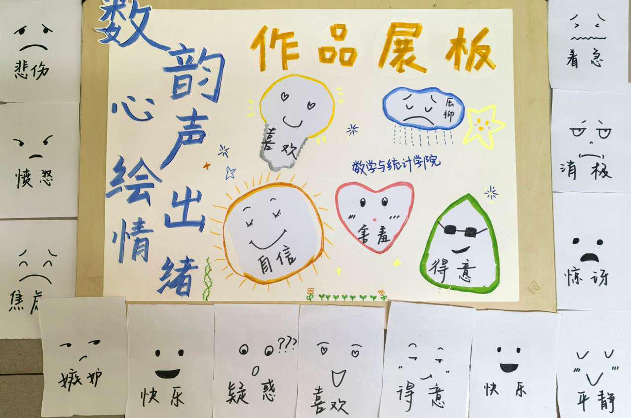 活动仪式,学院心理部成员精心筹备,在阳子湖畔布置好活动场地,并准备了彩笔、画纸、尺规等绘画工具及情绪卡片,为同学们提供丰富的创作素材与灵感来源。活动期间,同学们踊跃参与,将内心的喜怒哀乐通过绘画作品的形式呈现,并投入收集箱中。随后,心理部成员对收集到的绘画作品进行整理,依据作品所呈现的不同情绪予以分类,并将作品展示于逸夫楼五楼宣传栏,形成“数学情绪画廊”,为后续更有针对性地开展心理健康宣传工作积累了宝贵素材。