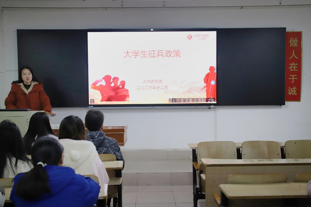 本网讯(通讯员 冯九转 黄煜婷/文 常国瑛/图)为切实做好征兵政策宣传工作,帮助大学生全面了解、掌握应征入伍相关政策,12月10日晚,我院于逸夫楼S505教室开展征兵政策宣传活动。本次活动由我院2022级辅导员冯九转主持,部分学生代表参加。