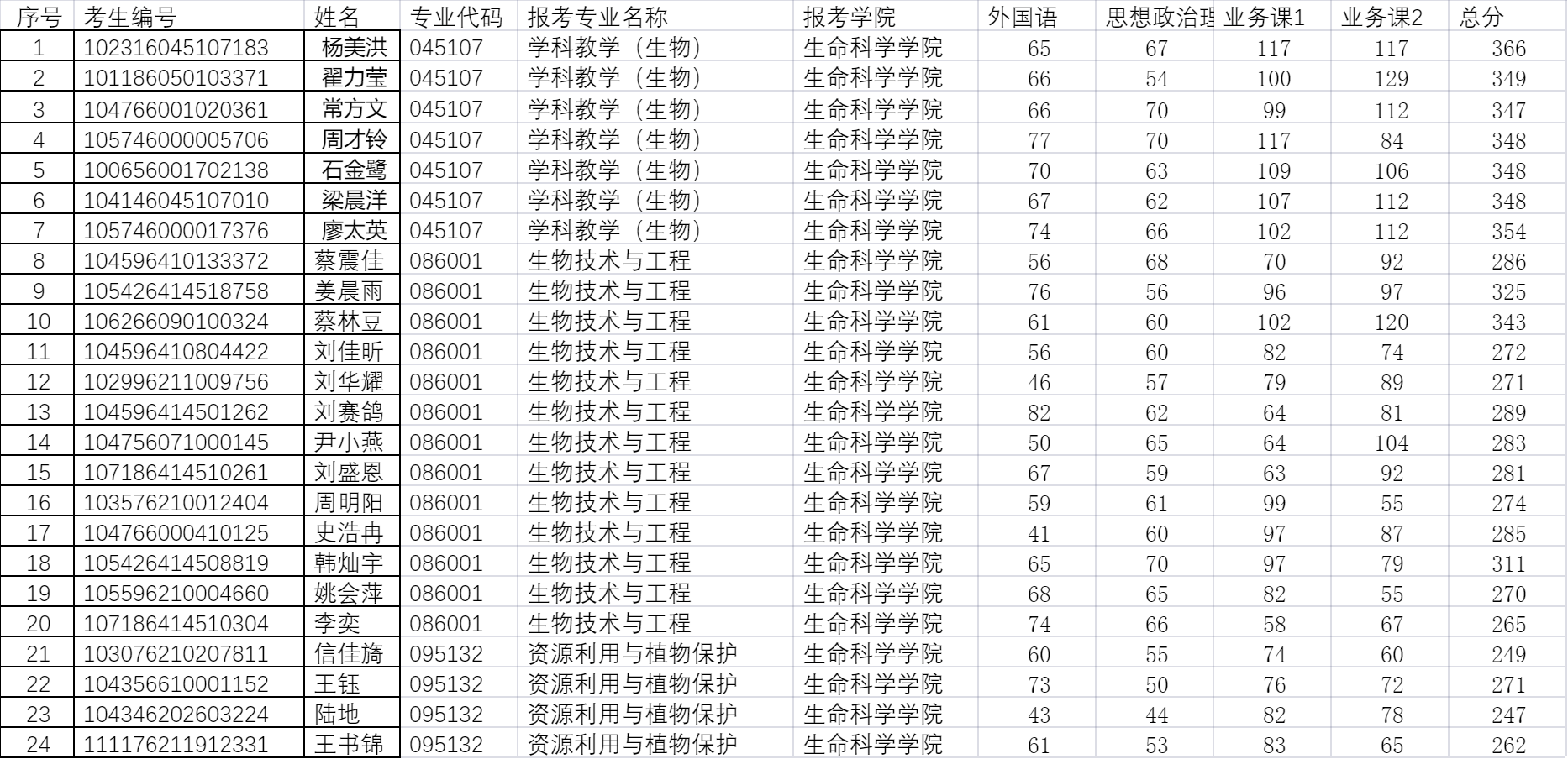 生命科学学院2026研究生一志愿最终成绩
