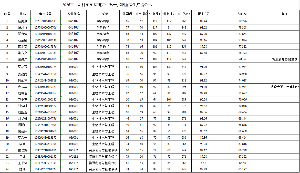 2026年生命科学学院研究生第一批调剂考生成绩公示