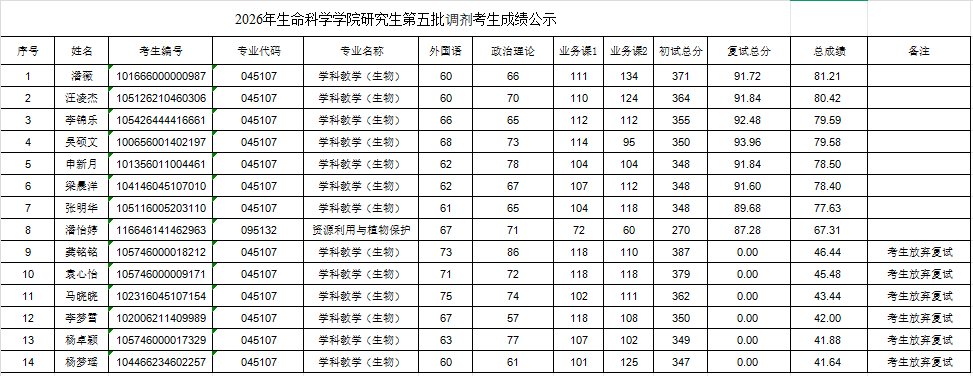 2026年生命科学学院研究生第五批调剂考生成绩公示
