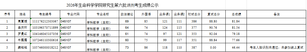 2026年生命科学学院研究生第六批调剂考生成绩公示