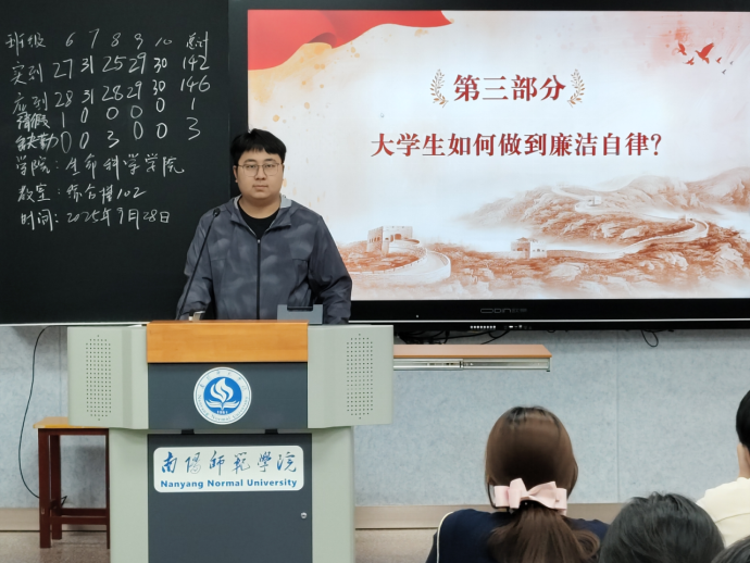 本网讯(通讯员 李恩会/文 王普/图)为进一步强化同学们的廉洁意识,培育清风正气的校园风尚,引导同学们在学习生活中恪守廉洁准则,9月29日,生命科学学院在综合楼101、102、103举办“廉洁”主题班会。本次班会由学习部主席赵焕基组织召开,25级全体同学及24级1至6班同学参加。