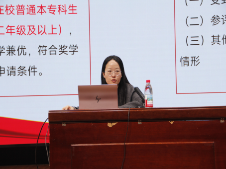 会议伊始,常佳围绕奖助学金的类型、申请条件及金额标准三个方面向同学们详细介绍资助政策,加深同学们对资助政策的了解。接着,常佳结合实例,为同学们介绍国家奖助学金评审材料的常见问题,帮助同学们解决申请过程中可能遇到的问题。最后,常佳鼓励受助同学们积极参与志愿服务和社会实践,培养社会责任感,提升综合素质,将个人的理想与国家的进步紧密融合,以满腔热忱和不懈奋斗为国家的繁荣贡献自己的力量。