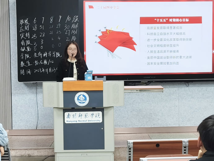 本网讯(通讯员 张梦冉/文 苗昀/图)为深入学习宣传贯彻党的二十届四中全会精神,强化同学们的理想信念,引导广大青年将思想和行动统一到全会部署上来,11月23日晚,生命科学学院在综合楼101、102组织召开“学习党的二十届四中全会精神”会议。本次会议由团学部部长郑真真组织召开,生命科学学院25级全体同学参加。