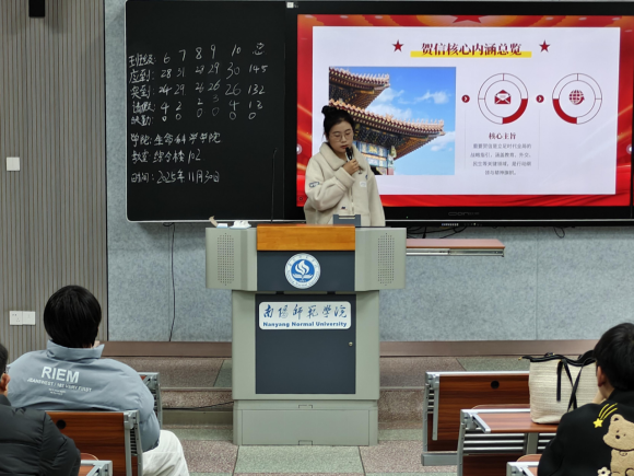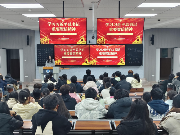 会议伊始,丁展颜围绕贺信的时代背景和重大意义进行系统阐述。她指出贺信不仅充分体现出习近平总书记对广大青年的亲切关怀和殷切期望,更是指导青年成长发展的重要文献,全体同学应当深刻理解贺信的丰富内涵,准确把握其精神实质。随后,卢莹莹向同学们重点解读贺信的实践要求,她强调同学们需将学习贯彻贺信精神与日常实践紧密结合,以坚定的理想信念筑牢精神根基,以扎实的专业学识提升能力素质,以积极的创新精神勇担时代重任。最后,丁展颜、卢莹莹号召同学们牢记贺信内容,深悟贺信精神,将小我融入大我,助力民族复兴。