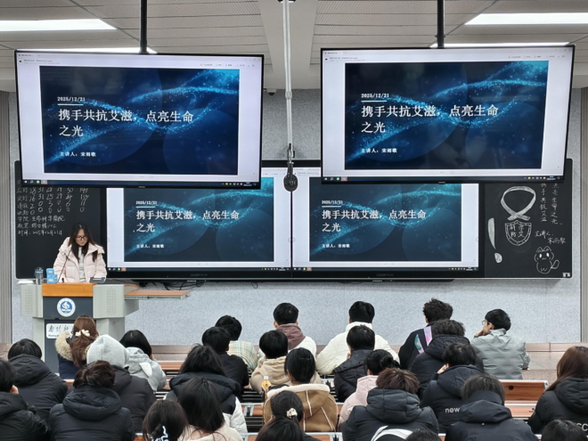本网讯(通讯员 石欣悦/文 王普/图)为增强同学们对艾滋病的认知,提高防艾抗艾意识,12月21日晚,生命科学学院在综合楼101和102召开“携手共抗艾滋,点亮生命之光”主题班会。本次会议由25级5班班团张福源和10班班团宋雨歌主持,25级全体同学参会。