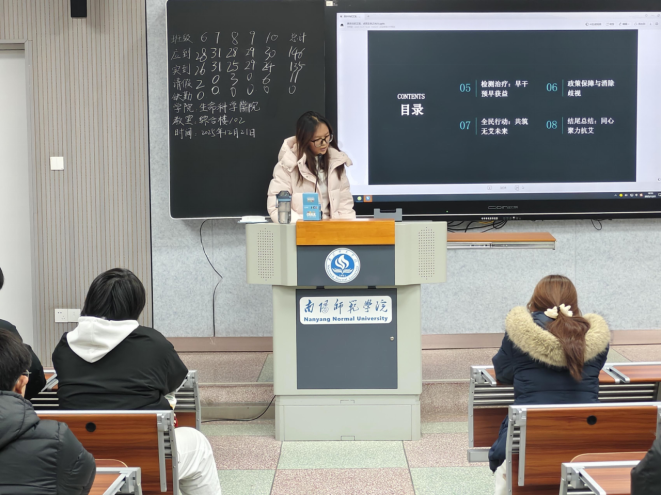 会议伊始,宋雨歌通过播放防艾公益短片,直观展现艾滋病对个人、家庭及社会造成的多重影响,快速吸引同学们的注意力。接着,宋雨歌结合详实数据与案例,从艾滋病的传播途径、发病机制到全球及本地疫情现状,进行系统科普讲解,明晰“防艾”知识要点。随后,宋雨歌播放专业防艾科普视频,从医学视角深入剖析艾滋病的检测、治疗手段,以及日常生活中的科学防护措施,强化同学们对防艾知识的理解。最后,宋雨歌总结发言,呼吁同学们以科学态度正视艾滋病,主动向身边人科普,传递抗艾正能量,构建无“艾”防护网。