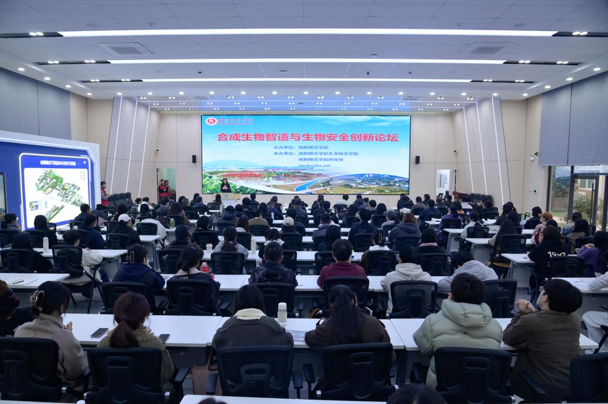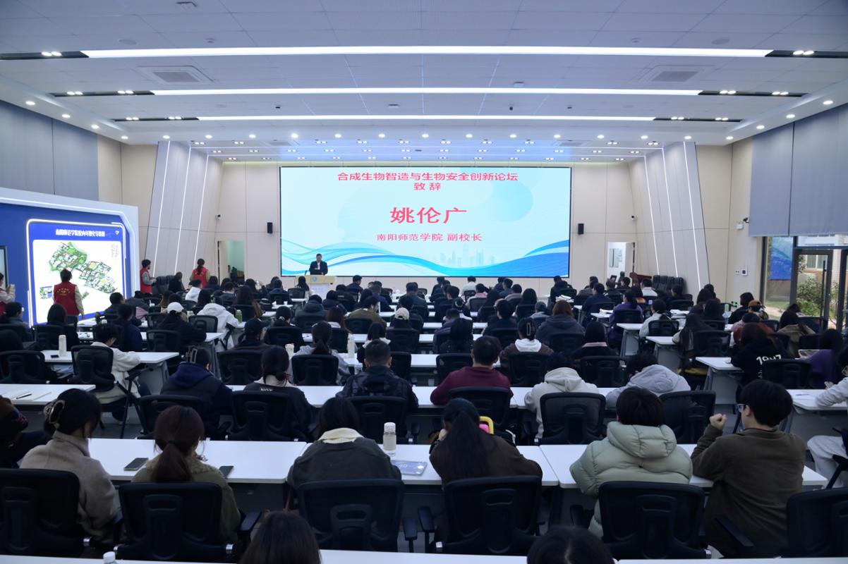 本网讯(徐丹丹/文 孙宏运 林冬梅/图)11月14-16日,由南阳师范学院主办,生命科学学院和科技处承办的“合成生物智造与生物安全创新论坛”在科技大楼一楼报告厅召开。副校长姚伦广出席开幕式并致辞。来自中国科学院、江南大学、天津大学、华东理工大学、大连理工大学、上海农科院、湖北工业大学、河南农业大学、重庆三峡学院、重庆文理学院等省内外十余所知名高校、科研机构及企业专家参加论坛。开幕式由生命科学学院院长牛秋红主持。