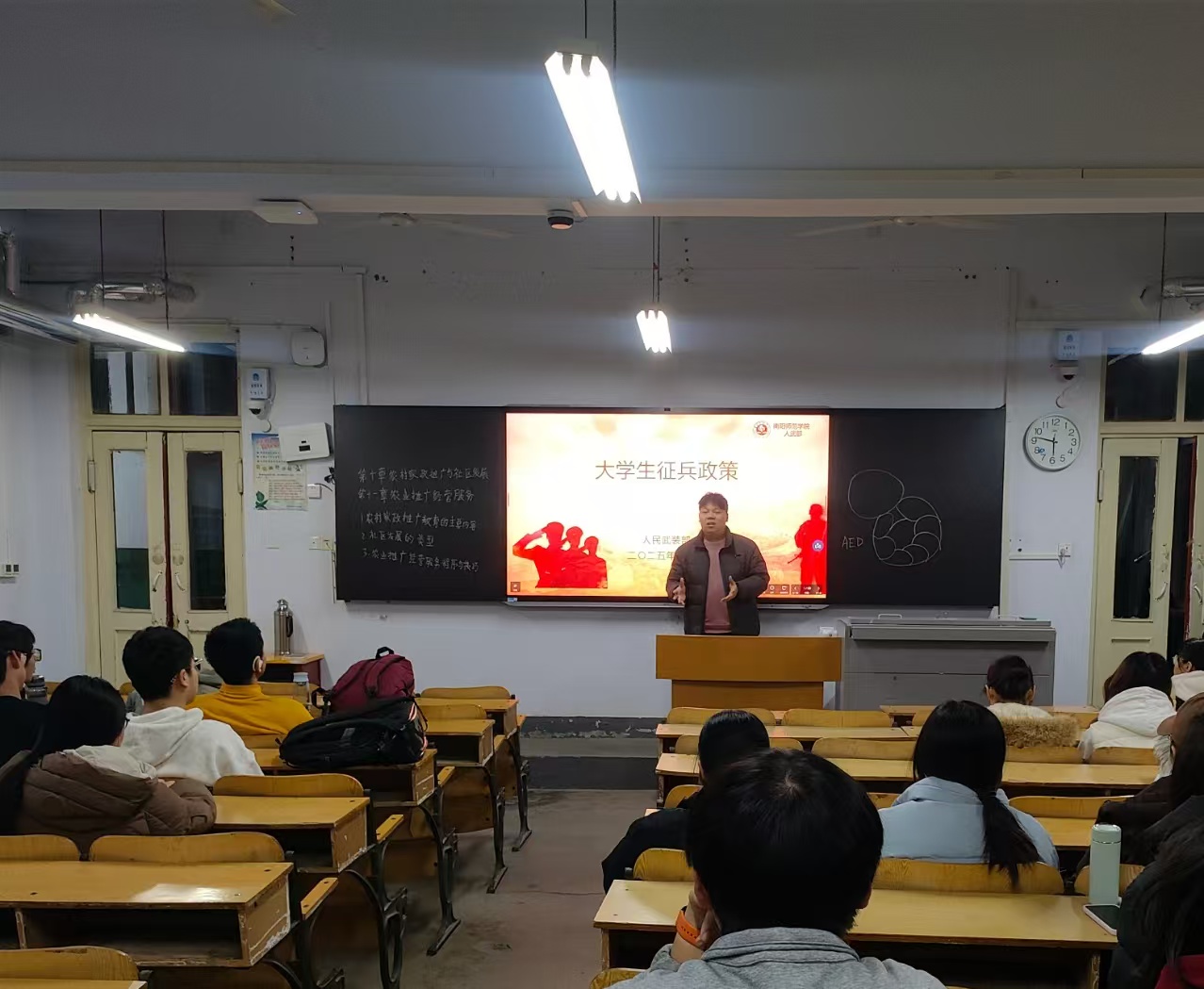 大会伊始,王荣欣紧扣2025年最新征兵政策,围绕征集对象与年龄限制、应征地选择、全国征兵网报名流程及时段等基础内容展开系统讲解,着重强调大学生可享受的“四个优先”政策与体检绿色通道这两项专属权益。随后,他针对大学生最关心的学业保留、学费补偿代偿、退役后就业创业扶持等优待举措,进行逐条梳理和细致解读。最后,他强调学院将持续跟进征兵咨询服务工作,为有志参军的大学生提供指导,及时解答大家后续的疑问,助力更多怀揣军营梦想的青年学子携笔从戎、建功立业,以青春热血书写报国华章。