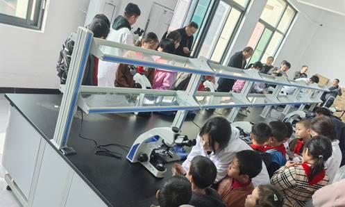 活动中,来自淅川县金河镇井沟小学的小学生们走进植物学实验室,在实验员的专业指导下了解显微镜的基本原理与规范操作流程,分步骤完成自来水样本玻片的制作,并在显微镜下进行观察。通过直观的微观图像,学生认识到日常生活中的水体蕴含丰富的微观世界,对细菌等微生物有了初步科学认知,进一步激发了探究兴趣与动手能力。本次开放日将抽象的科学知识与具体的生活场景相结合,有助于引导小学生树立正确的饮水卫生观念,养成良好的个人卫生习惯,提升科学素养。