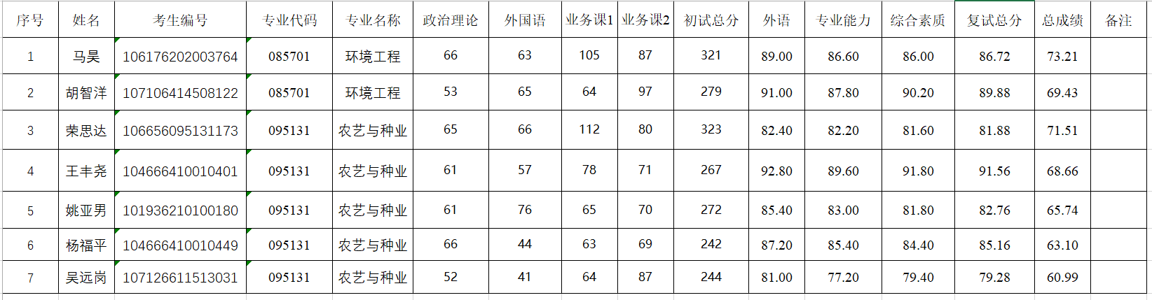 我院2026年硕士研究生招生调剂志愿(第一批)复试工作已顺利完成。现将考生成绩予以公示。学院将根据学校下达的招生计划和复试录取政策,按考生总成绩分专业排名依次开展拟录取工作。考生成绩如下: