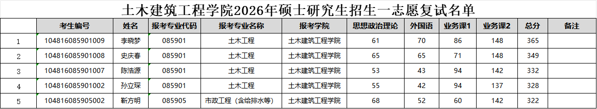 土木建筑工程学院2026年硕士研究生招生一志愿复试名单