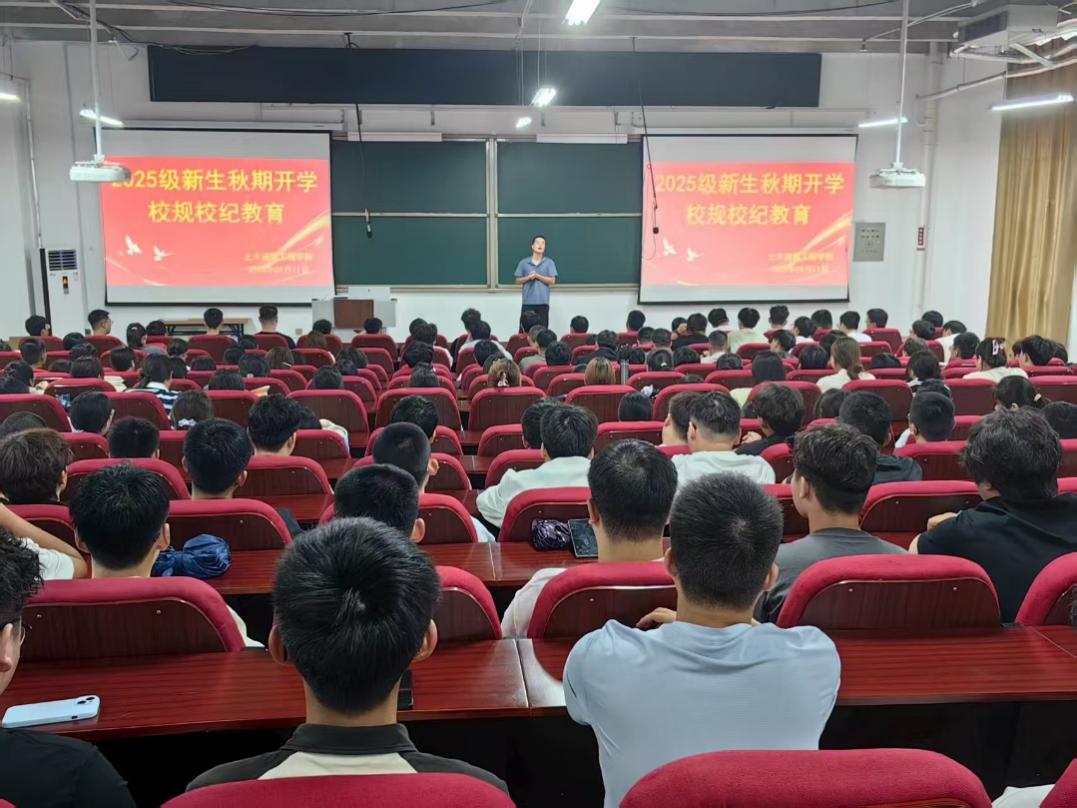 本网讯(通讯员 叶慧/图文)为帮助2025级新生尽快适应大学生活,增强纪律意识,土木建筑工程学院于2025年9月11日,在实训楼4201会议室开展“2025级新生秋期开学校规校纪教育”主题班会。此次班会由辅导员张永旺主持,25级全体学生参加。