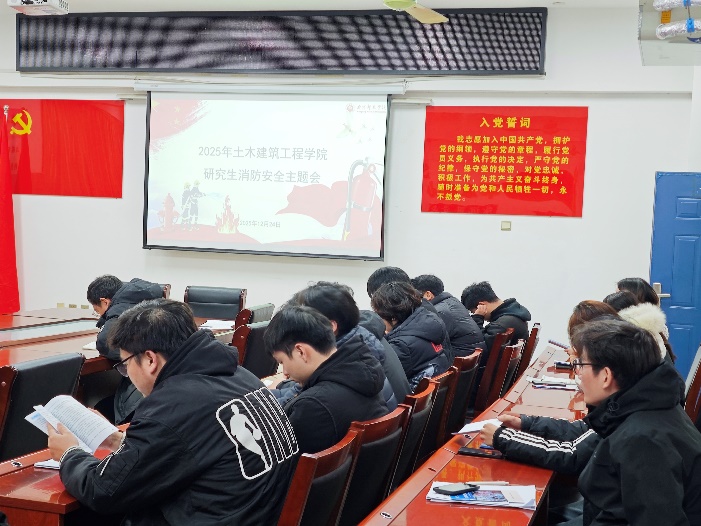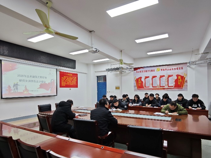 2025年12月24日,土木建筑工程学院在实训楼3411室组织召开研究生消防安全教育专题会。学院副院长徐中华、实验室主任王军国、实训中心主任郑文豫、研究生秘书武宇、辅导员贺钰及全体在校研究生参会,共筑校园安全防线。