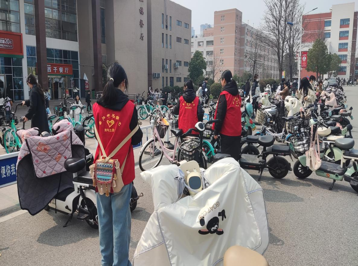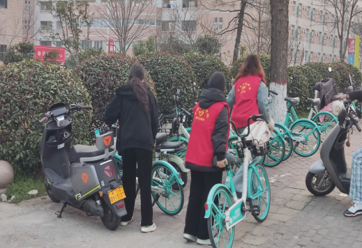 结束了会议室的清洁工作,志愿者们转移至校园内的主要交通干道及西区食堂门口的停车点。面对停车区内随意停放、甚至倒在绿化带边缘的电动车,志愿者们发扬不怕苦、不怕累的精神,齐心协力将一辆辆沉重的电动车挪至指定停车线内。在整理车辆的同时,志愿者们还化身“文明宣讲员”,劝导同学们自觉遵守校园交通秩序,在指定区域文明停放,不堵塞消防通道,共同维护校园“脉络”的畅通。