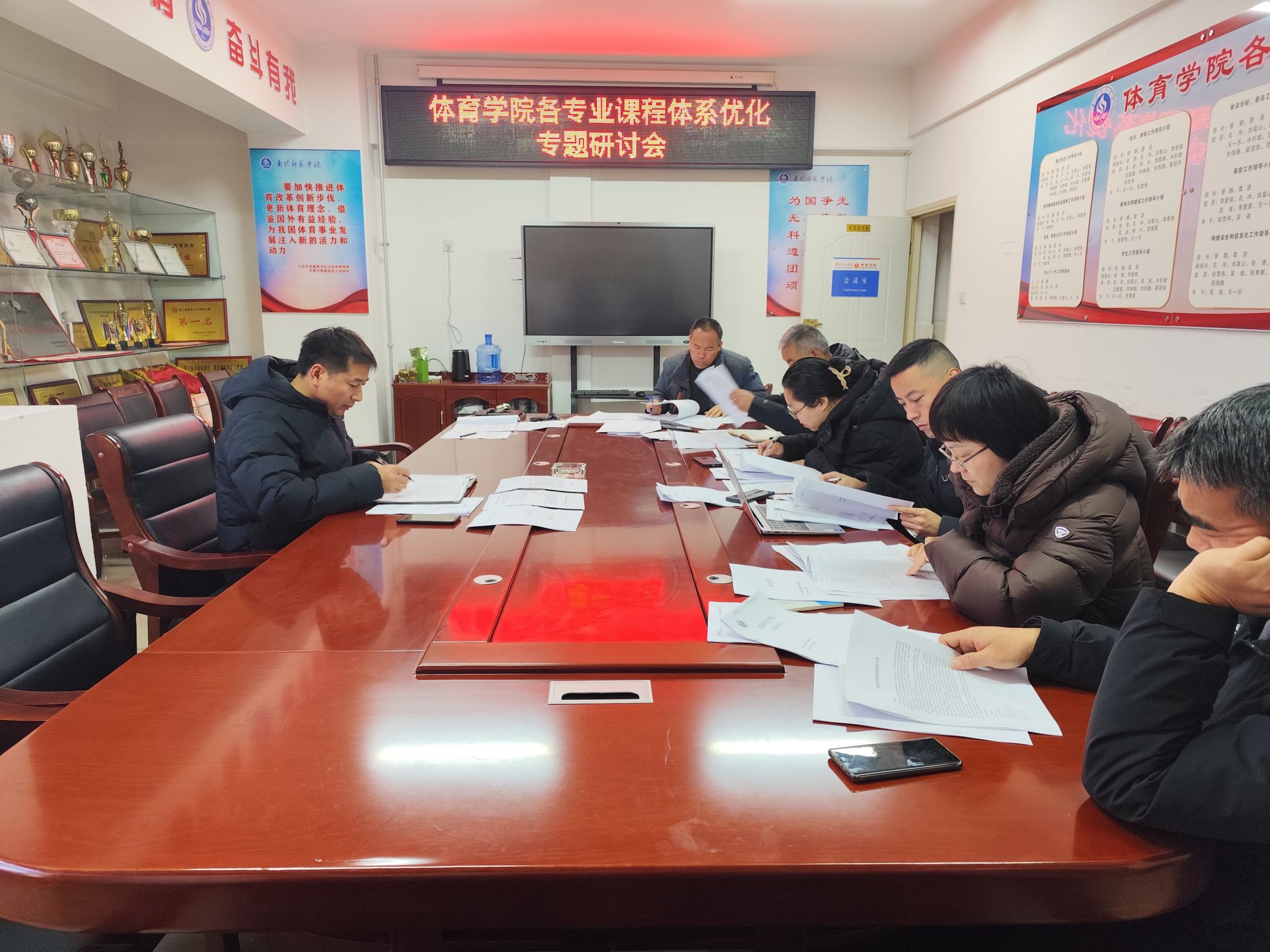 本网讯(通讯员 李新锋)12月19日,体育学院各专业课程体系优化研讨会在体育馆301会议室召开。体育学院副院长孔冲、教学秘书吴迪、各专业系主任和教研室主任参与研讨。