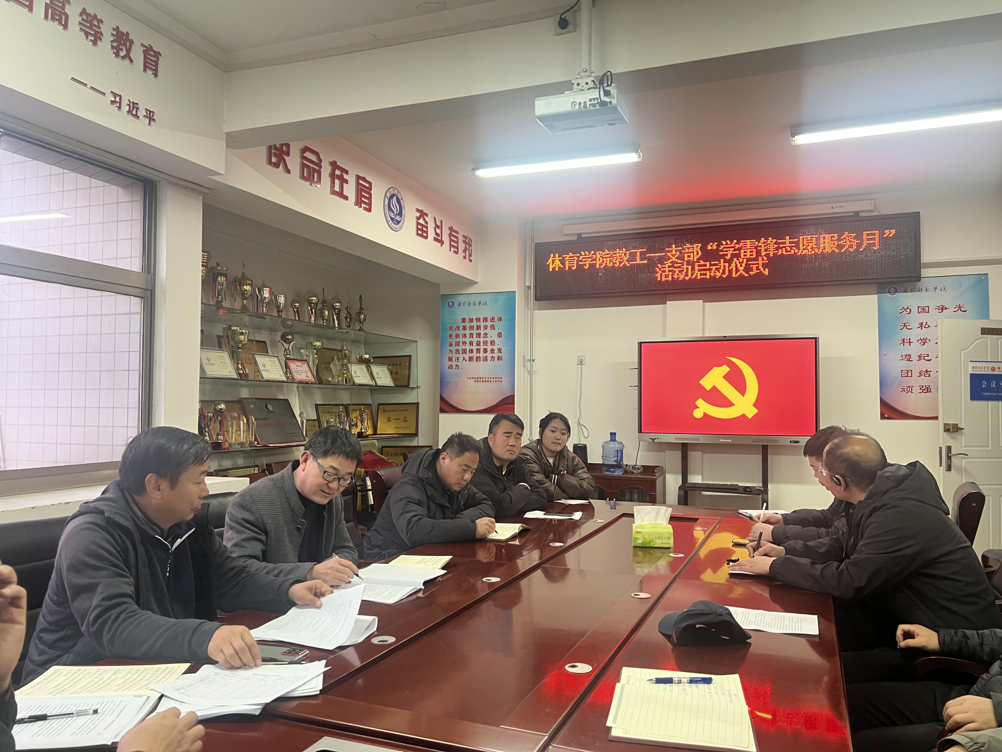 本网讯(段立军/文 孟军/图)3月5日,体育学院教工第一党支部举行学雷锋志愿服务月启动仪式,全体党员教师参加会议。