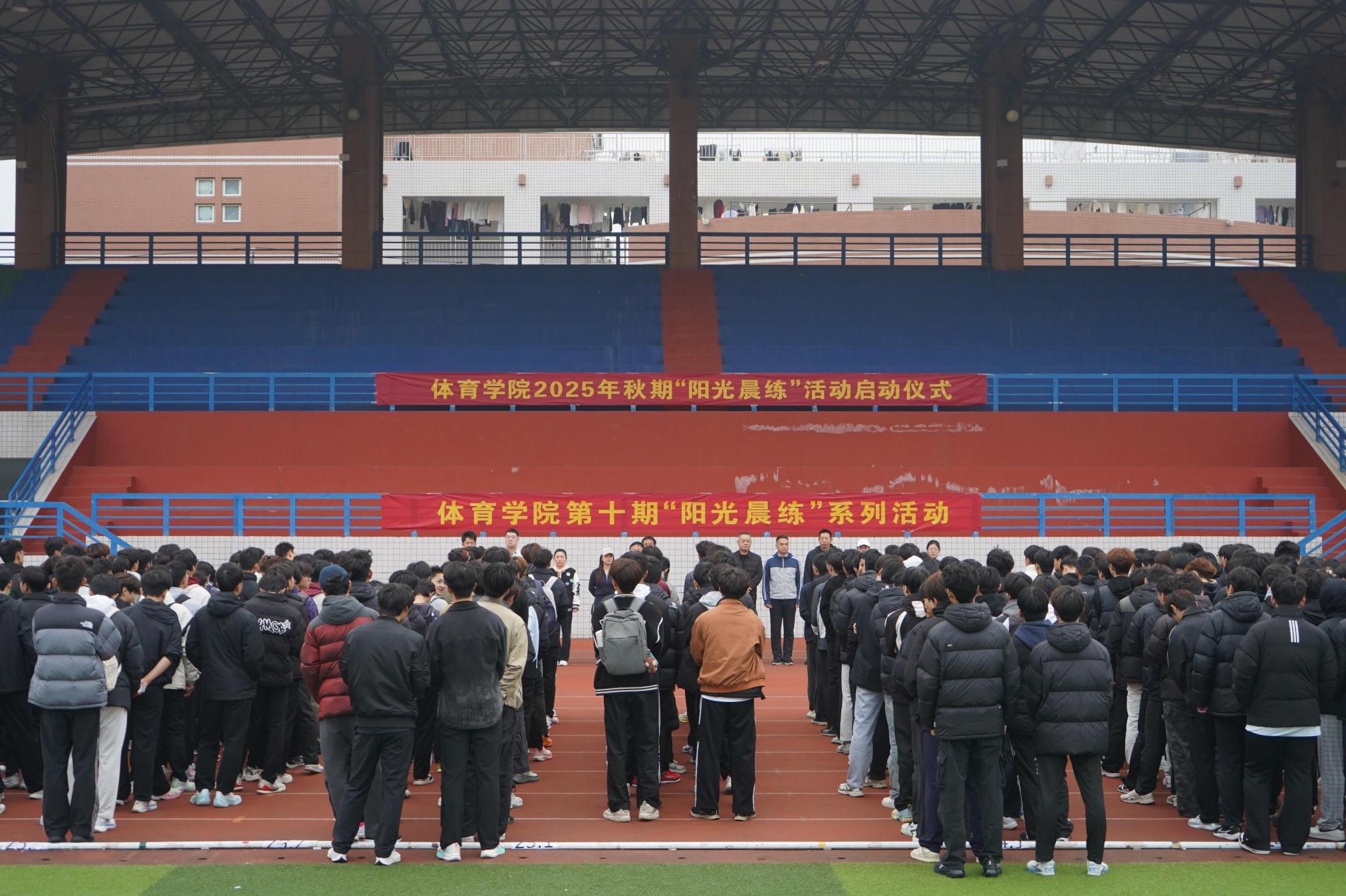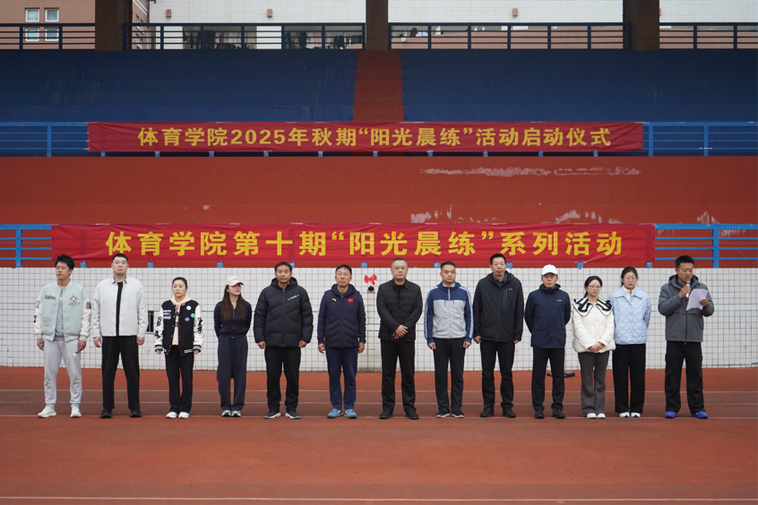 本网讯(通讯员李璇/文 郭梓新/图) 10月29日早晨,体育学院2025年秋季第十期“阳光晨练”系列活动于中区体育场正式启动。体育学院全体班子成员、学工队伍以及2024、2025级全体同学共同参与此次启动仪式,活动由团委书记王一乐主持。