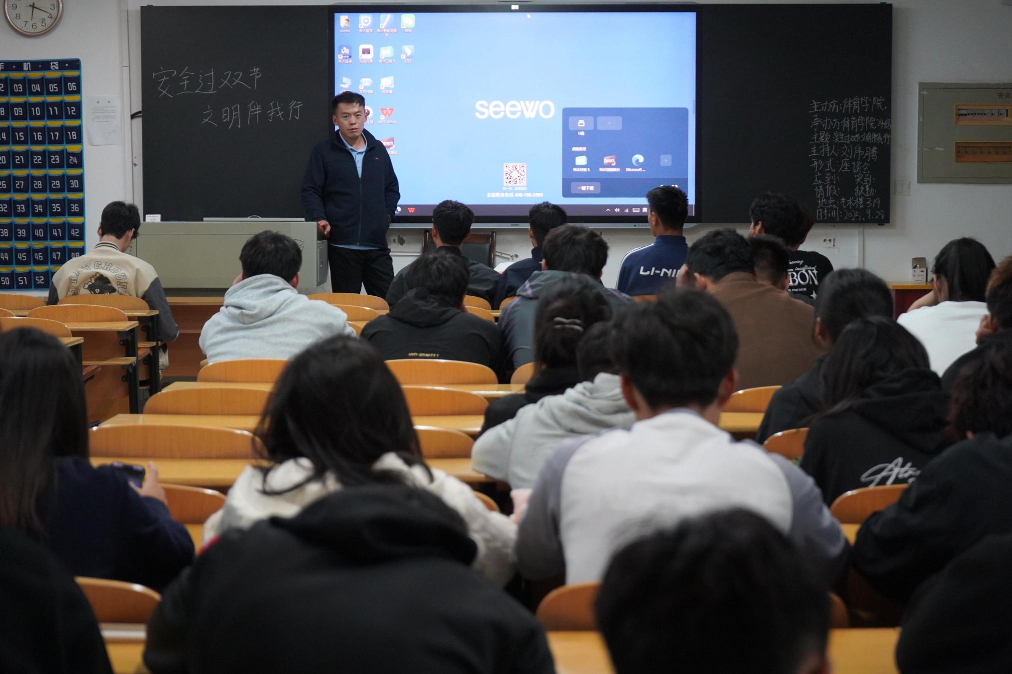 会议伊始,辅导员刘伟腾借助PPT,向同学们直观展示了交通安全、消防安全、网络安全及饮食卫生等核心内容。重点强调了节日期间人流车流密集,需严格遵守交通规则,杜绝骑行违规车辆、横穿马路等危险行为。随后,他围绕家居安全,明确用电、用火、饮食卫生等注意事项,杜绝安全隐患。最后,辅导员进行总结,强调学生们将安全知识落细落实,把文明行为融入假期点滴。