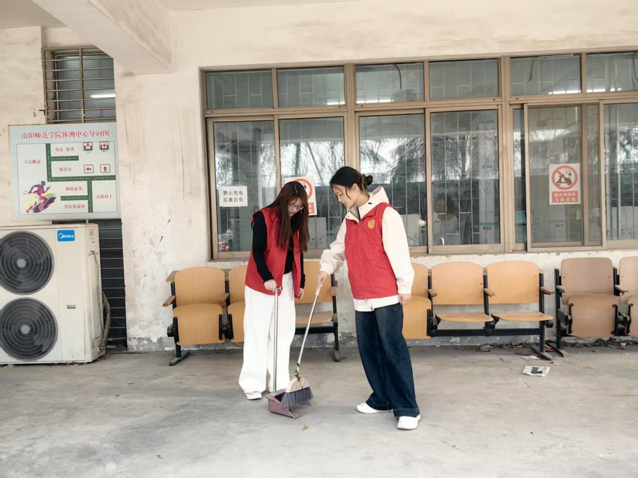 3月22日,志愿者在体育馆门前及艺术楼门口开展卫生清洁志愿服务活动。志愿者们分工协作,对学院教学楼、公共运动场等区域进行全面清扫,重点清理绿化带垃圾、擦拭公共设施并整治卫生死角,以实际行动践行“垃圾不落地”理念,有效改善了校园环境卫生,也增强了同学们的文明素养、责任意识与奉献精神。