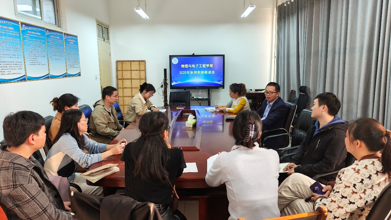 (通讯员 王志鹏)为深入落实立德树人根本任务,强化教学过程管理,破解教学实践难题,2025年11月5日下午,南阳师范学院物理与电子工程学院在科技楼301会议室召开2025年秋期教师座谈会。学院院长、教学副院长、教学秘书、各教研室主任及部分青年教师代表齐聚一堂,共话教学发展,共谋质量提升。