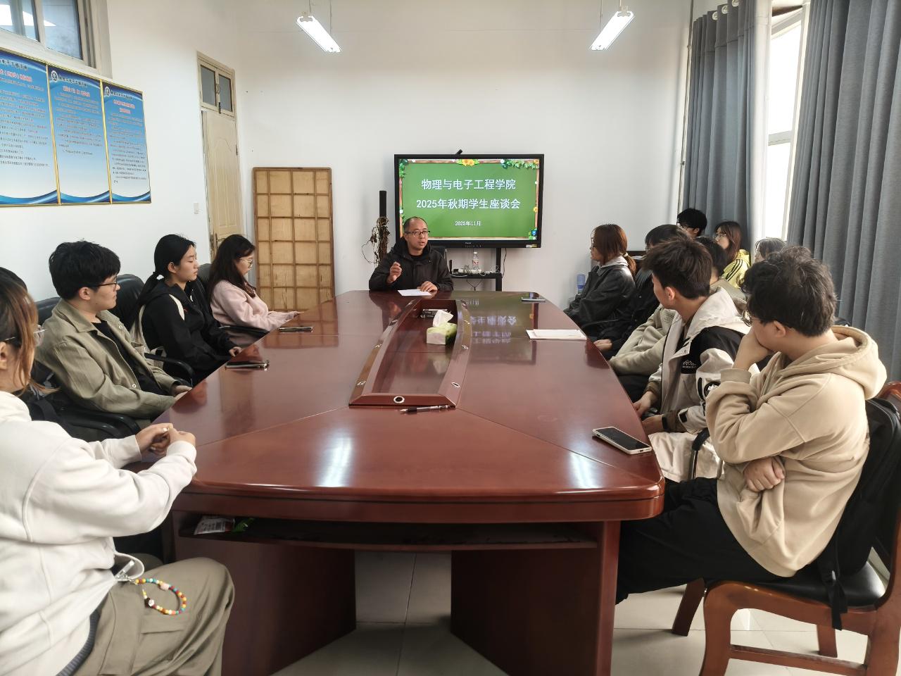 本网讯(通讯员包聪会 武晓雅/文 朱逸涵/图)为精准把握学生学习需求,优化教学模式,提升育人质量,物理与电子工程学院于11月5日在科技楼301会议室召开2025年秋期学生座谈会。本次座谈会由教学秘书王志鹏主持,各系主任和各年级不同专业学生代表参加。