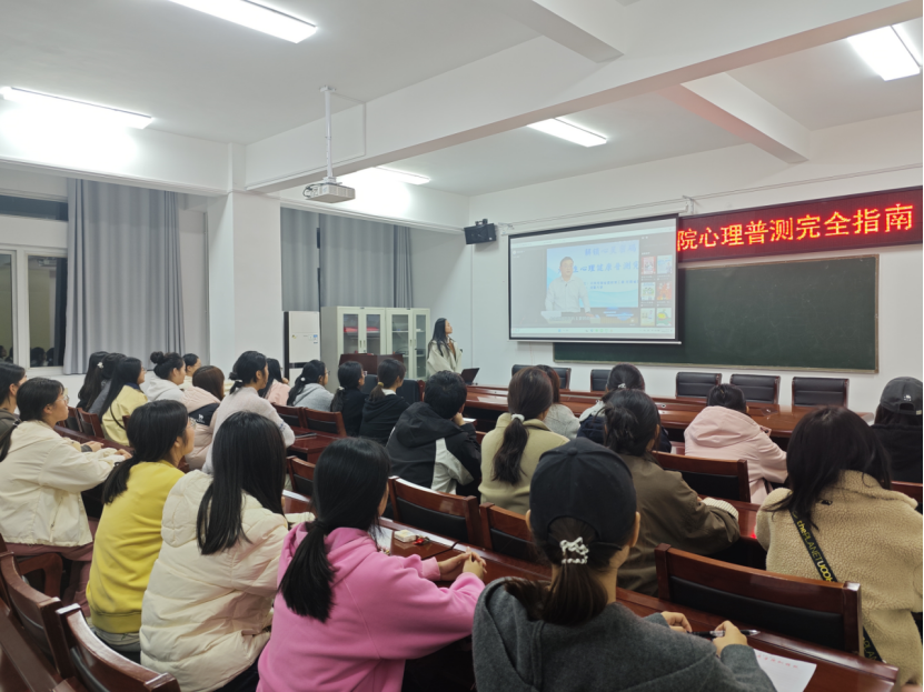 本网讯(通讯员冯若丹 赵婷婷/文 姚玉婷/图)为引导学生科学认识心理健康普测,提升心理调适能力,物理与电子工程学院心理部于11月14日组织同学们在科技楼241教室观看“解锁心灵密码 大学生心理健康普测完全指南”主题心理健康公开课。