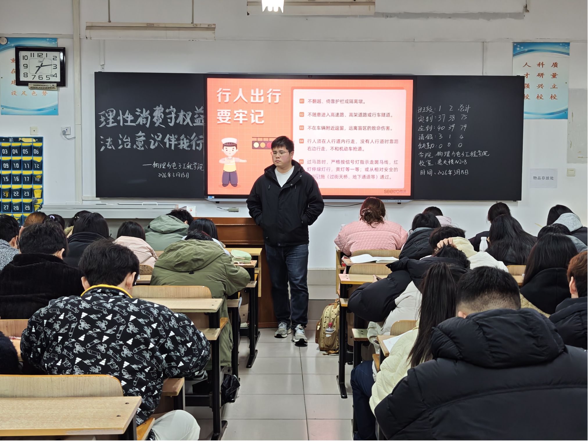 本网讯(通讯员 沈鹏超 孙璟垚/文 赵婷婷/图)为引导同学们树立理性消费观念,增强法治意识和消费维权能力,物理与电子工程学院于2026年3月15日在逸夫楼W101、W103、W104、N208教室召开“理性消费守权益,法治意识伴我行”主题班会。本次班会由25级辅导员艾克拜尔主持,沈鹏超主讲,25级全体学生参与其中。