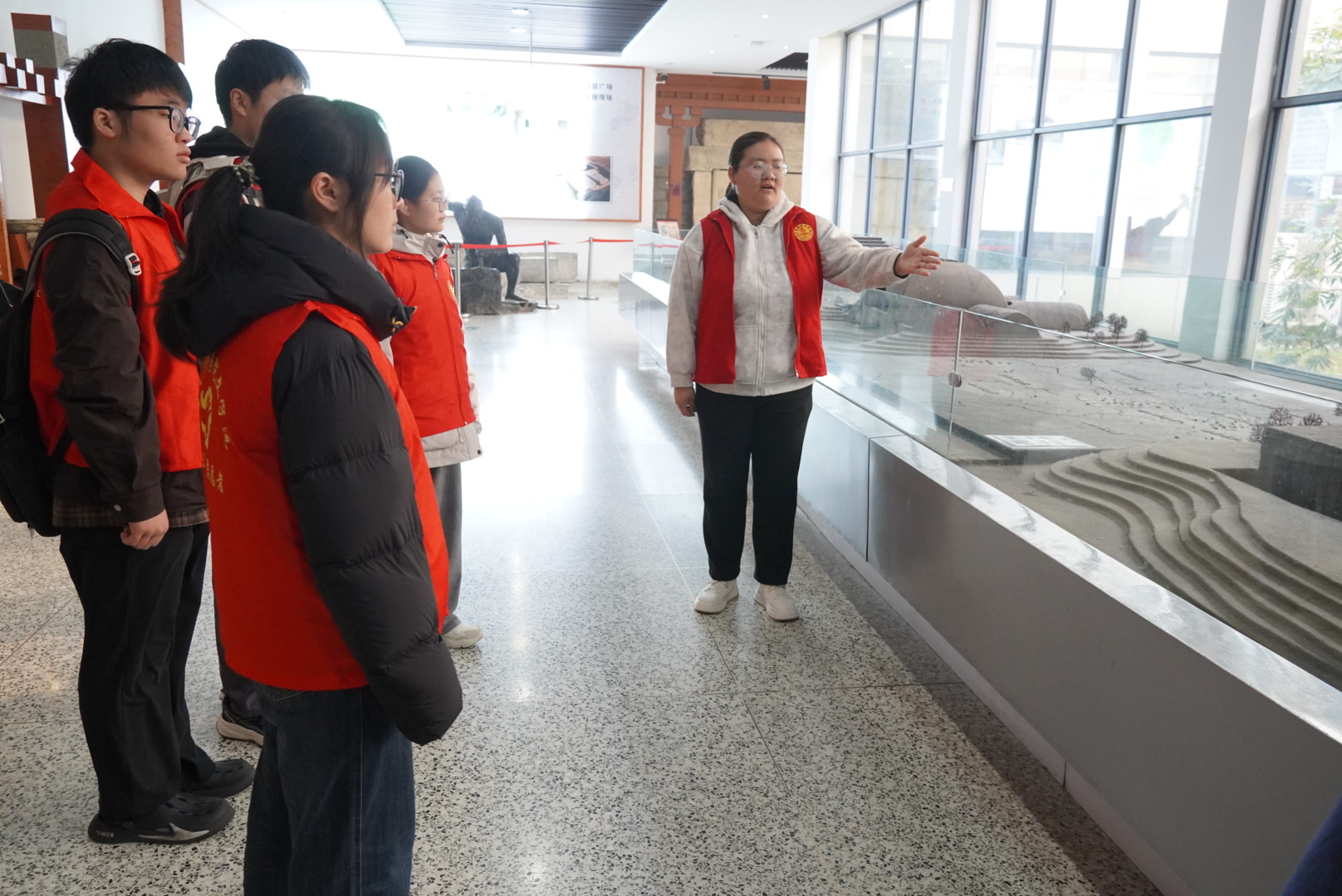 同学们完成分组后,满怀热情投入活动。一部分同学在讲解员的引导下参观汉画馆,仔细观赏汉画像石、画像砖,了解其历史背景与文化内涵,感受汉代社会的礼乐风尚。另一部分同学则向游客讲解汉画故事,普及汉代历史文化知识,引导公众关注和保护文化遗产。大家纷纷表示,通过此次活动,不仅加深了对汉画艺术的理解,更坚定了守护历史文脉、讲好中国故事的责任感。