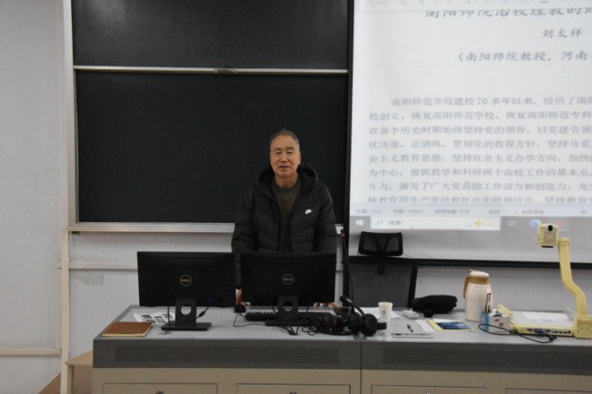 本网讯(通讯员 李斐然 张佳 方蒙恩 王毅然/文 张雨萌 银子惠/图)为引导2025级新生坚定理想信念,深刻感悟学校深厚的历史底蕴,赓续传承学校宝贵的精神财富,10月22日下午,外国语学院于外语楼312教室组织召开了“南阳师院治校理教的政治智慧和人文精神”理想信念专题报告会。本次报告会特邀河南省文史馆馆员、南阳师范学院刘太祥教授担任主讲,由郭一丹老师主持,部分2025级新生参会。