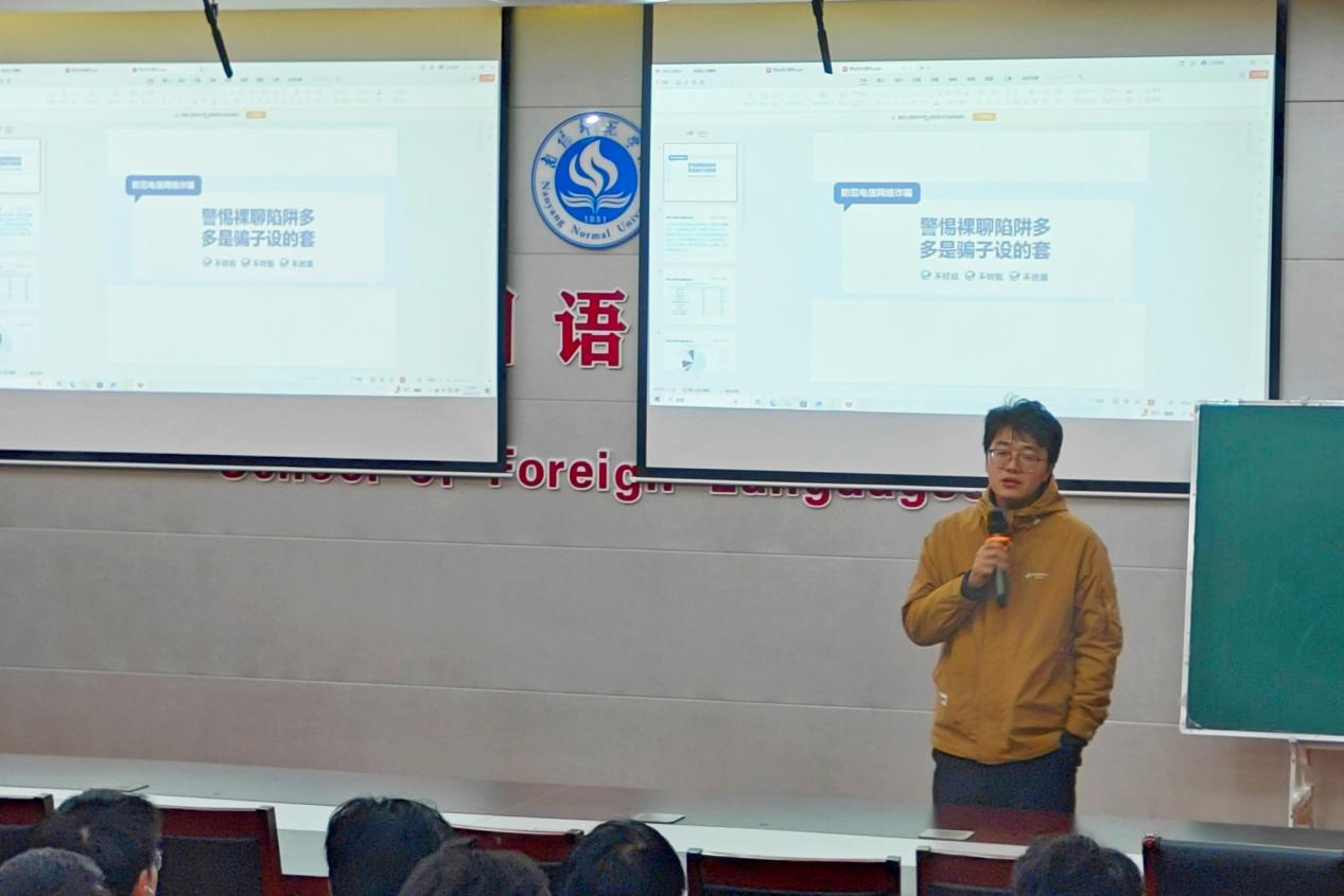 本网讯(通讯员 李斐然 李世豪 张佳 王泓心 张雨萌/图文)为进一步增强学生防诈骗安全意识,提升风险防范能力,11月7日,外国语学院组织开展防范电信网络诈骗主题会议。本次会议由学院23级辅导员李世豪老师主持,外国语学院全体男生参会。