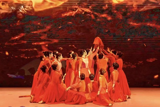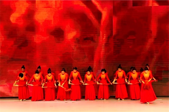 比赛现场,低沉的音乐渐起,舞者们身着渐变红裙登台,以蜷缩的姿态勾勒“黑暗中的微光”;当节奏转向激昂,数十条红绸从人群中扬起,如星火汇聚成焰,中央舞者高擎折扇的造型,恰似“火种”刺破暗夜。每一次舒展的肢体、每一个坚定的表情,都将“星星之火可以燎原”的精神内核具象化。表演尾声,灯光渐暗,舞者们以簇拥的造型定格,赢得台下掌声如潮。